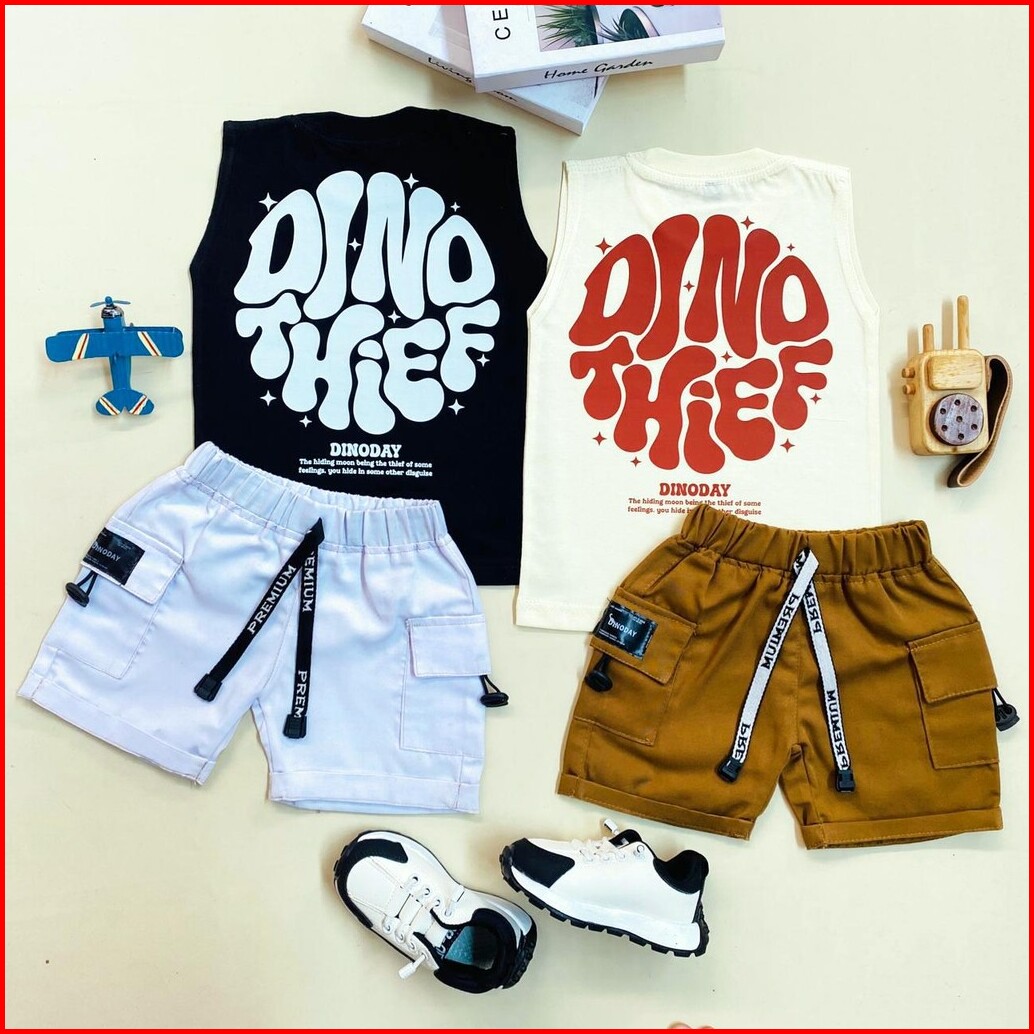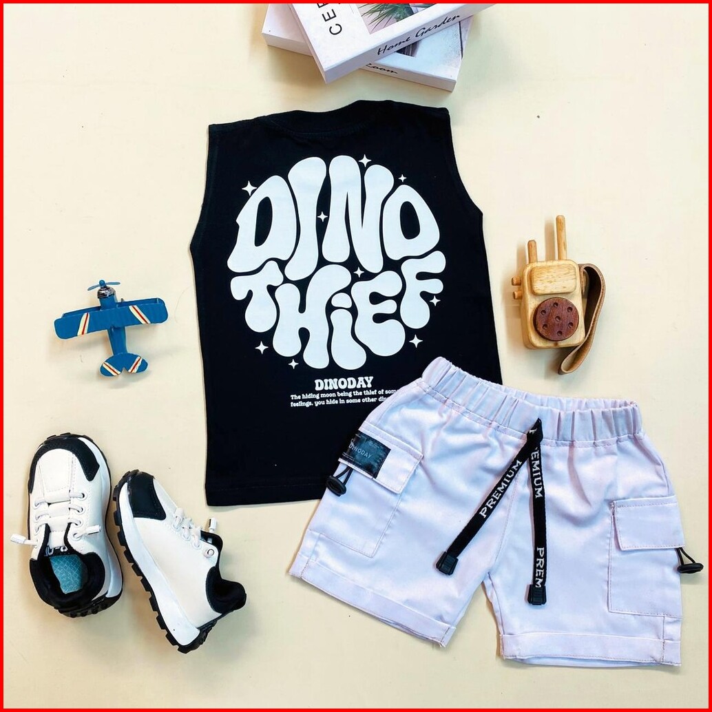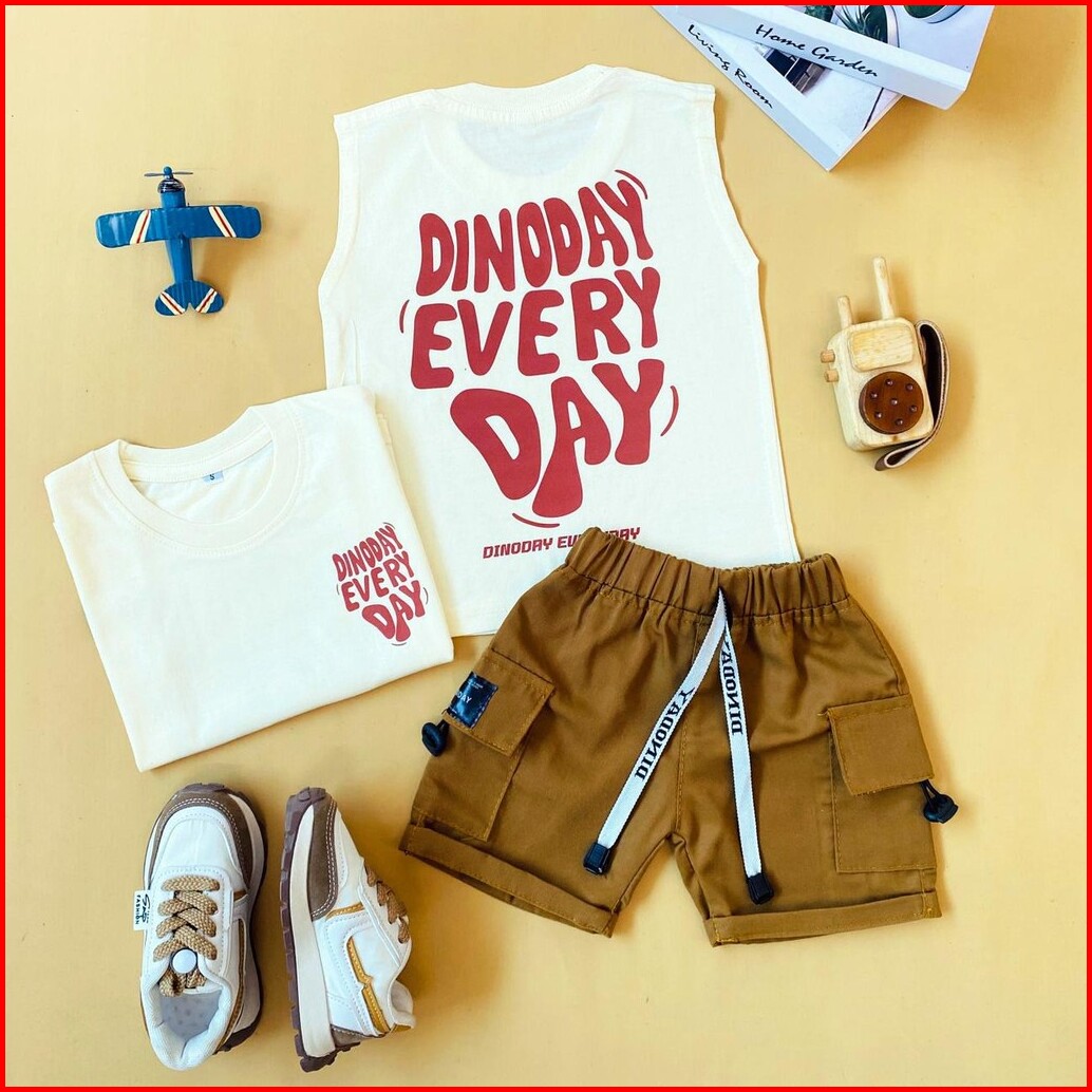 Estishop X Dinoday Stelan Baju Anak Laki Laki Kaos Kutung Singlet Celana Cargo Premium Usia 1-9 Tahun