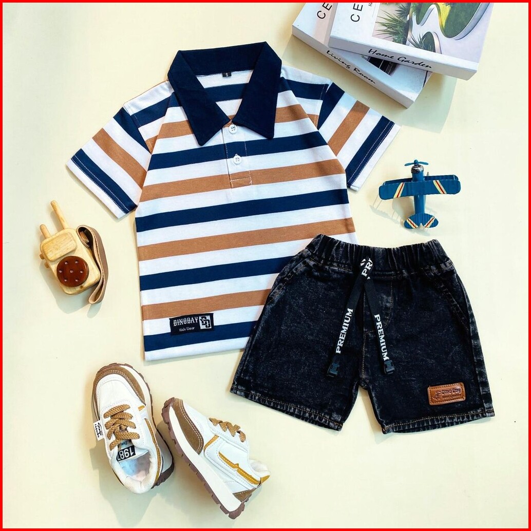Estishop X Dinoday Setelan Anak Laki Laki Perempuan Baju Kerah Salur Stripe Celana Pendek Cargo 1-7 Tahun
