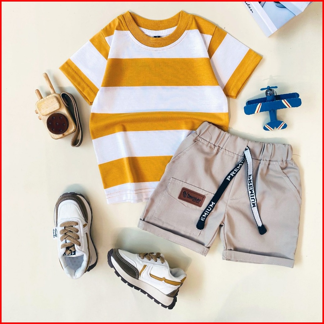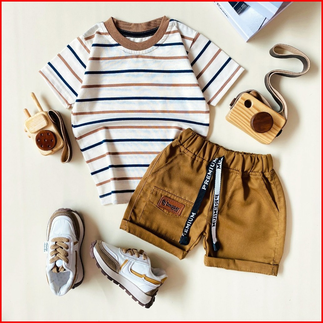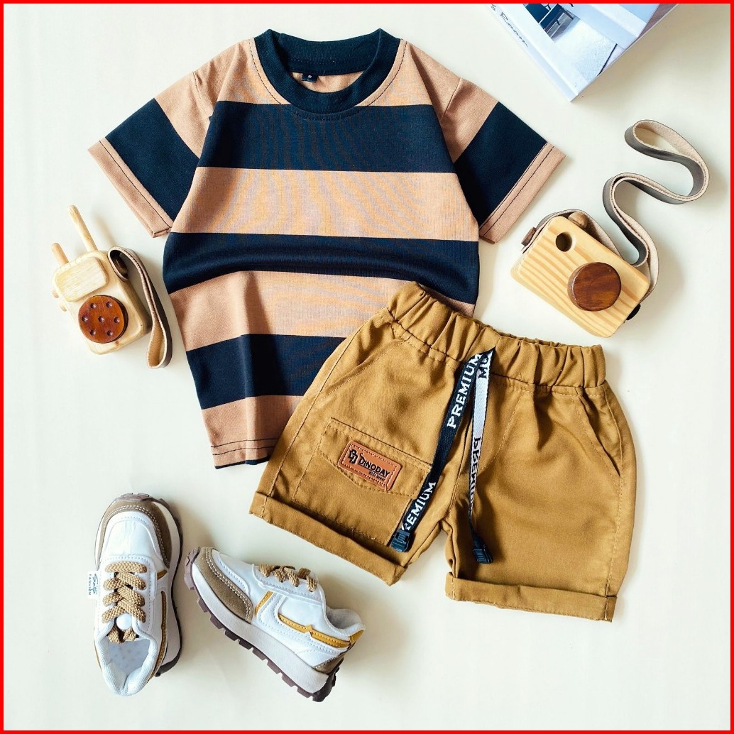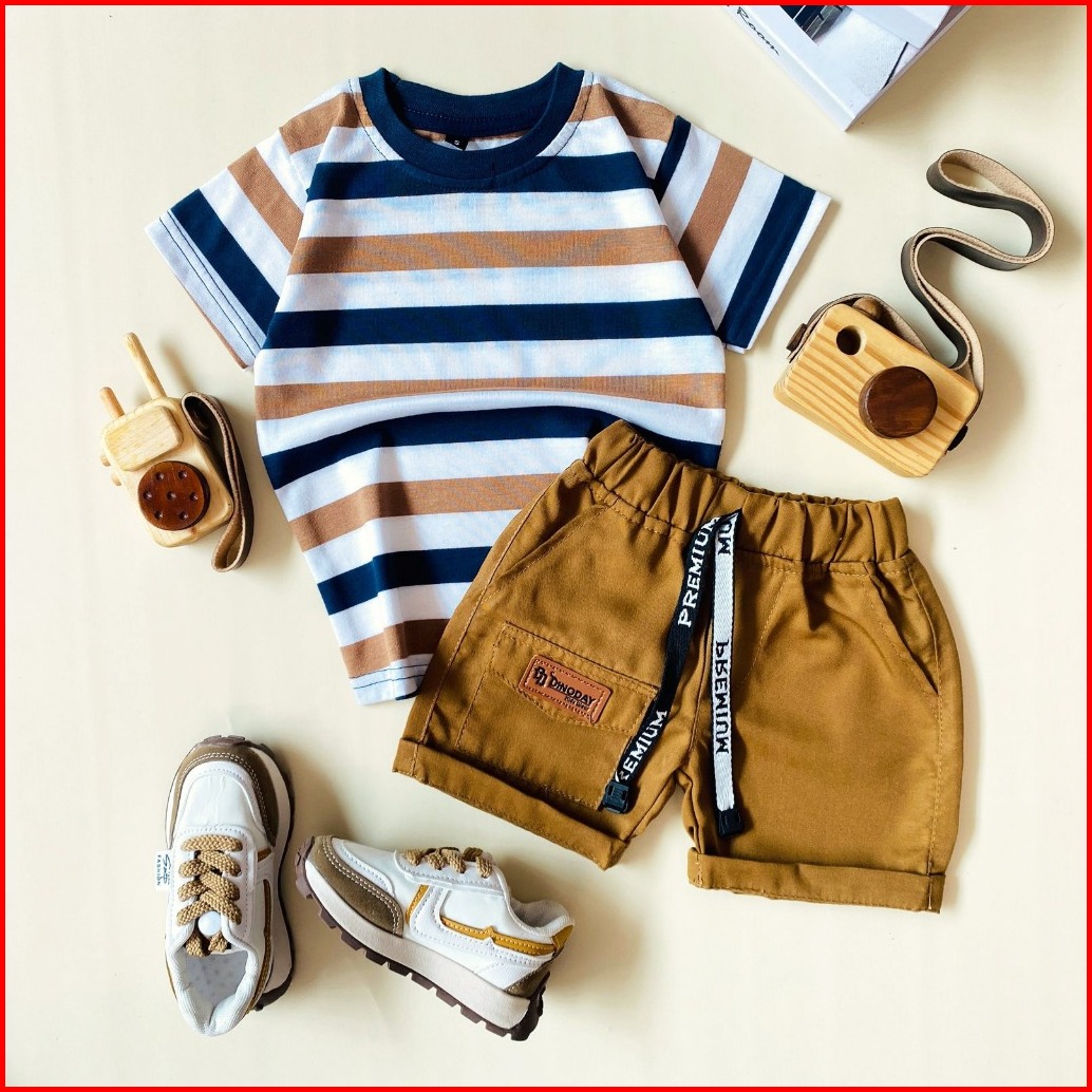 Estishop Setelan Anak Laki Perempuan Kaos Stripes Celana Cargo Saku Hotpants Korean Style