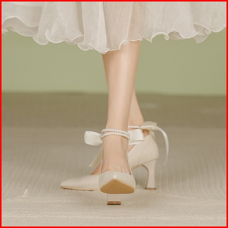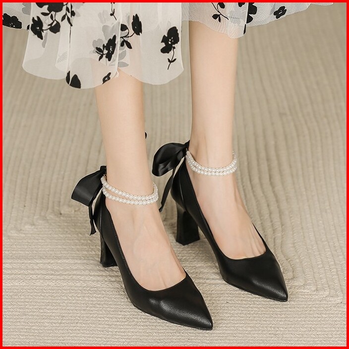 Findal Sepatu Heels Wanita Hils Kasual Tali Mutiara Hiasan Pita Korean Style Ki-118