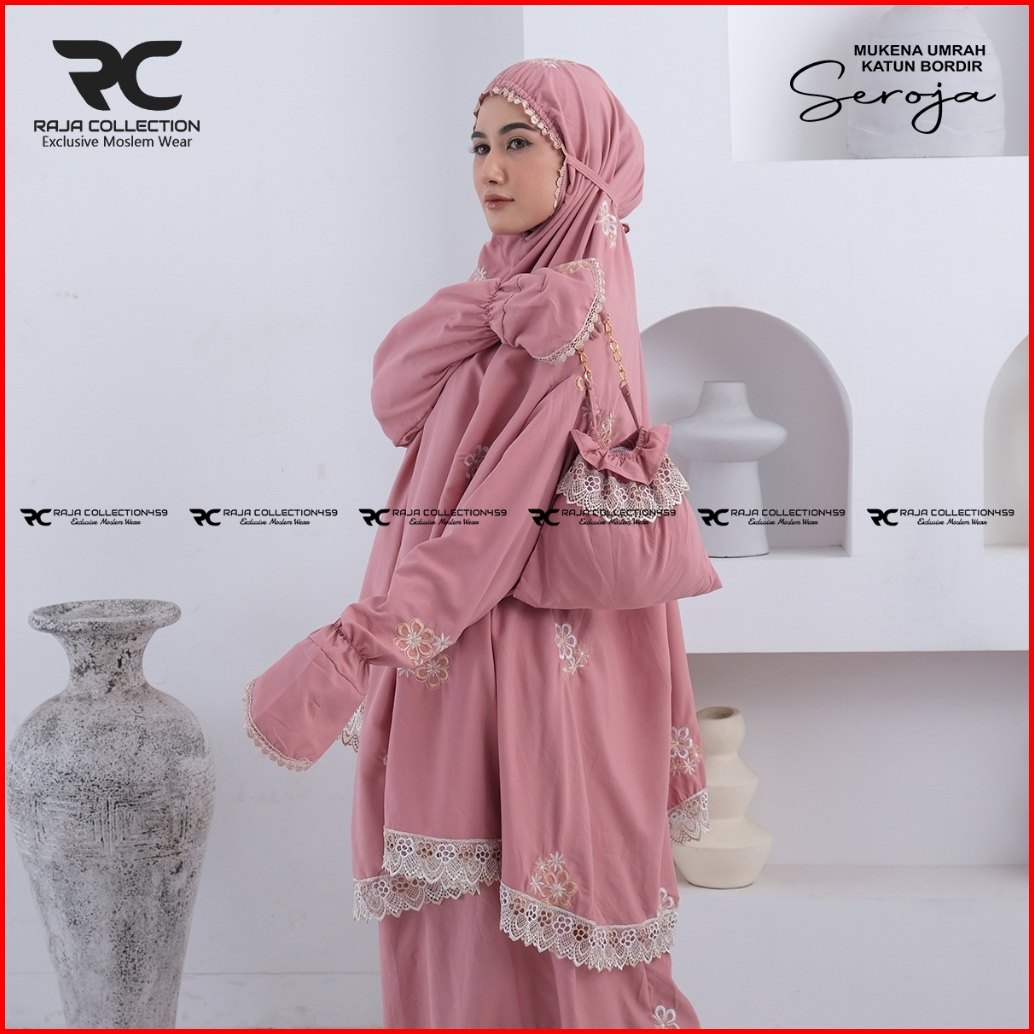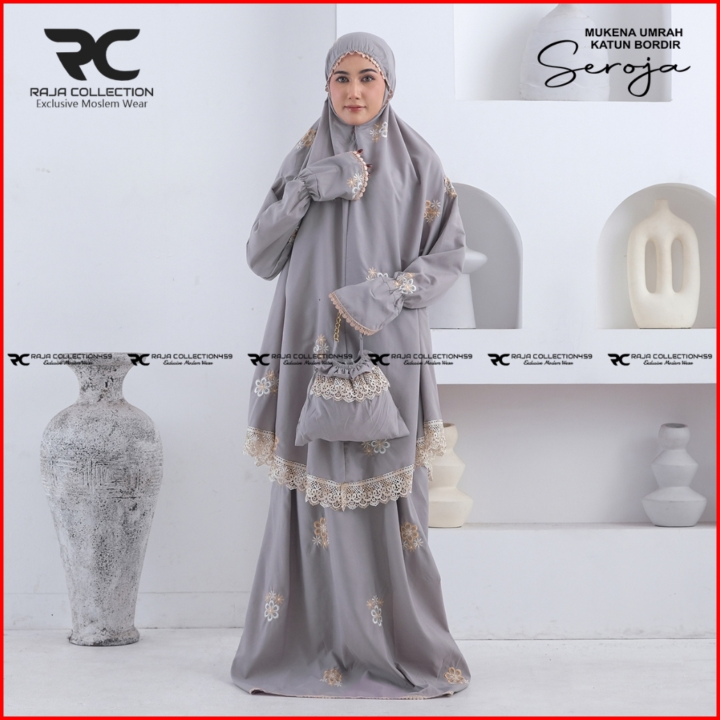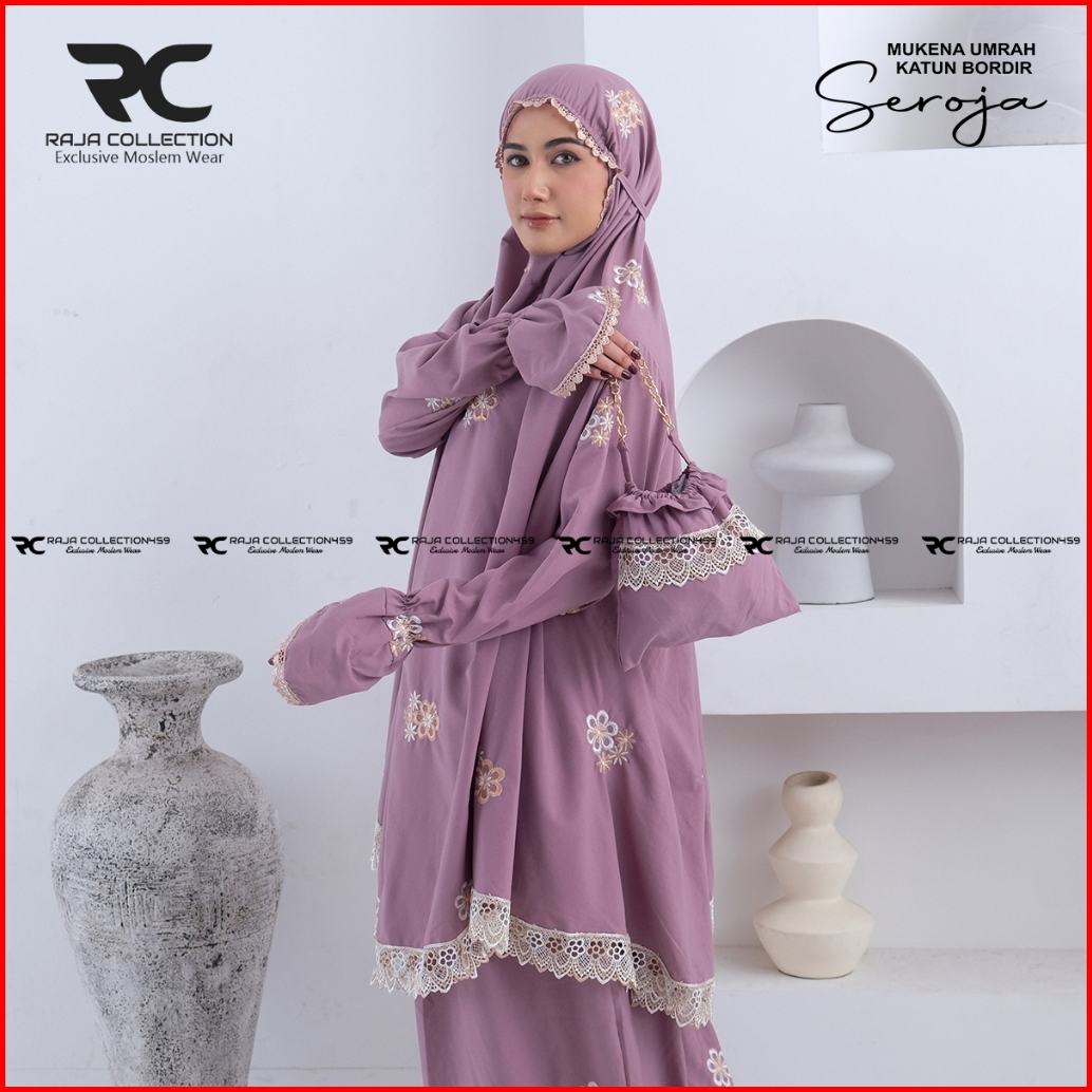 Raja Collection459 - Mukena Dewasa Jumbo Katun Premium Umrah Haji Atas Bawah Berlengan Bordir Seroja