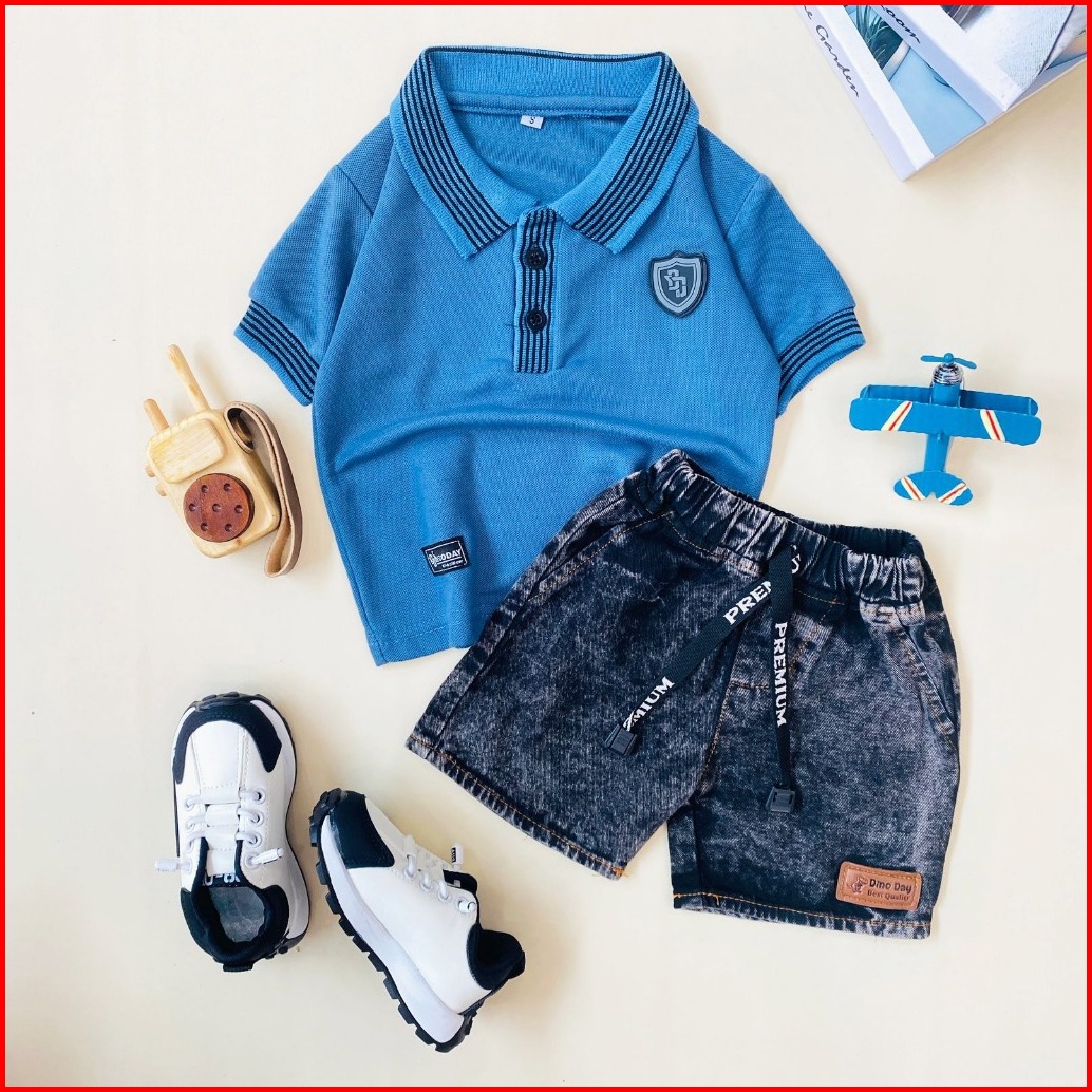 Estishop X Dinoday Setelan Anak Laki Baju Kaos Kerah Polo Korean Celana Cargo Hotpants 1 - 9 Tahun
