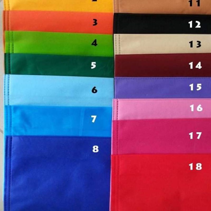 Putih , merah , maroon , pink, hijau muda , hijau tua , toska, biru muda , biru tua, biru navy, oren , coklat , ungu , kuning , cream, abu-abu