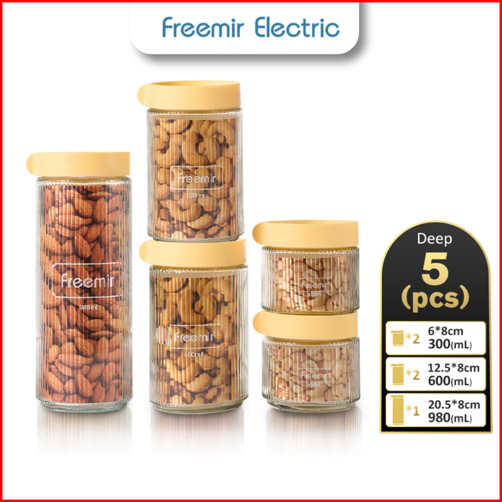 Ready Freemir Toples Kaca Bening Aesthetic Set 5 Pcs Glass Storage Jar Kedap Air Anti Bocor Penyimpan Minyak Snack Benin