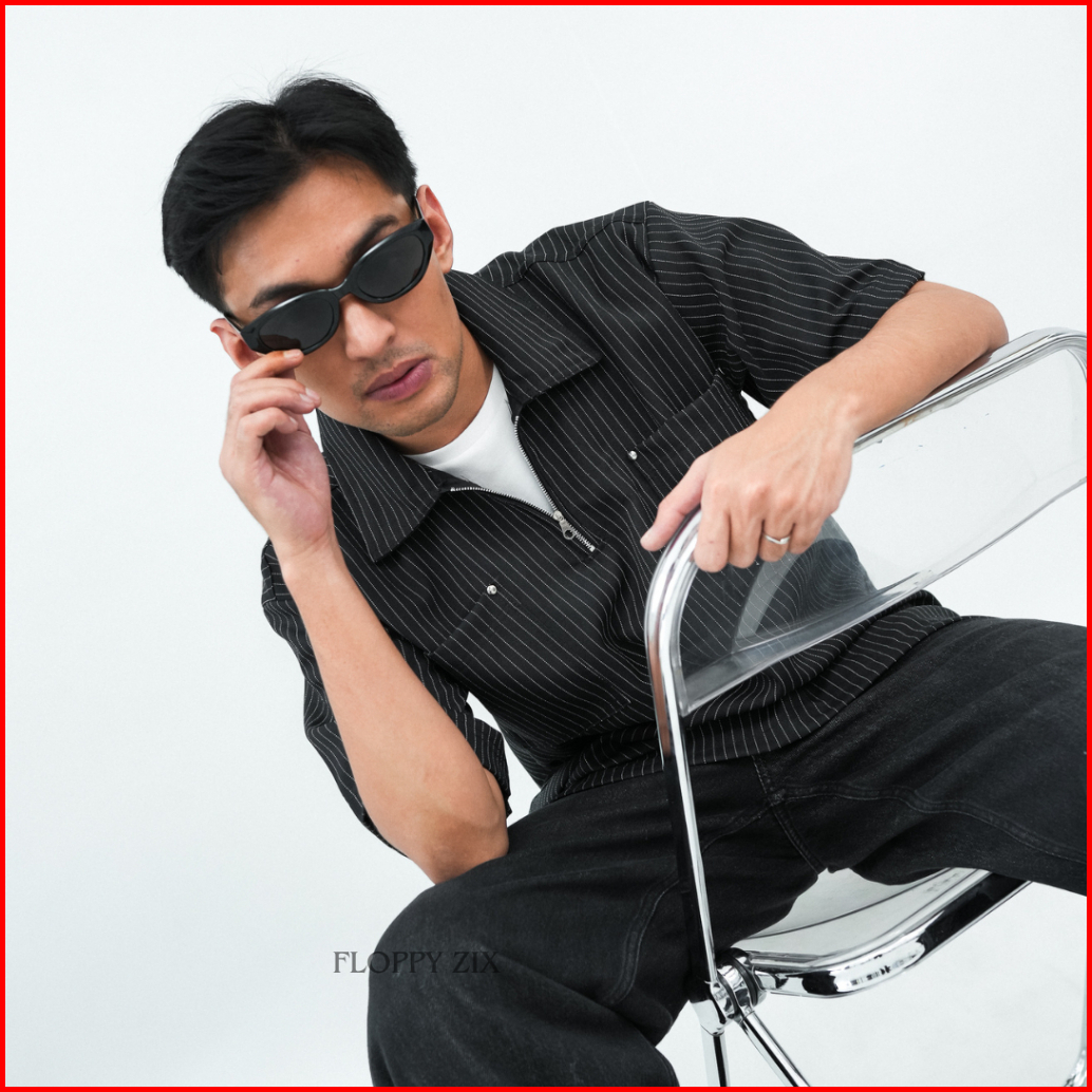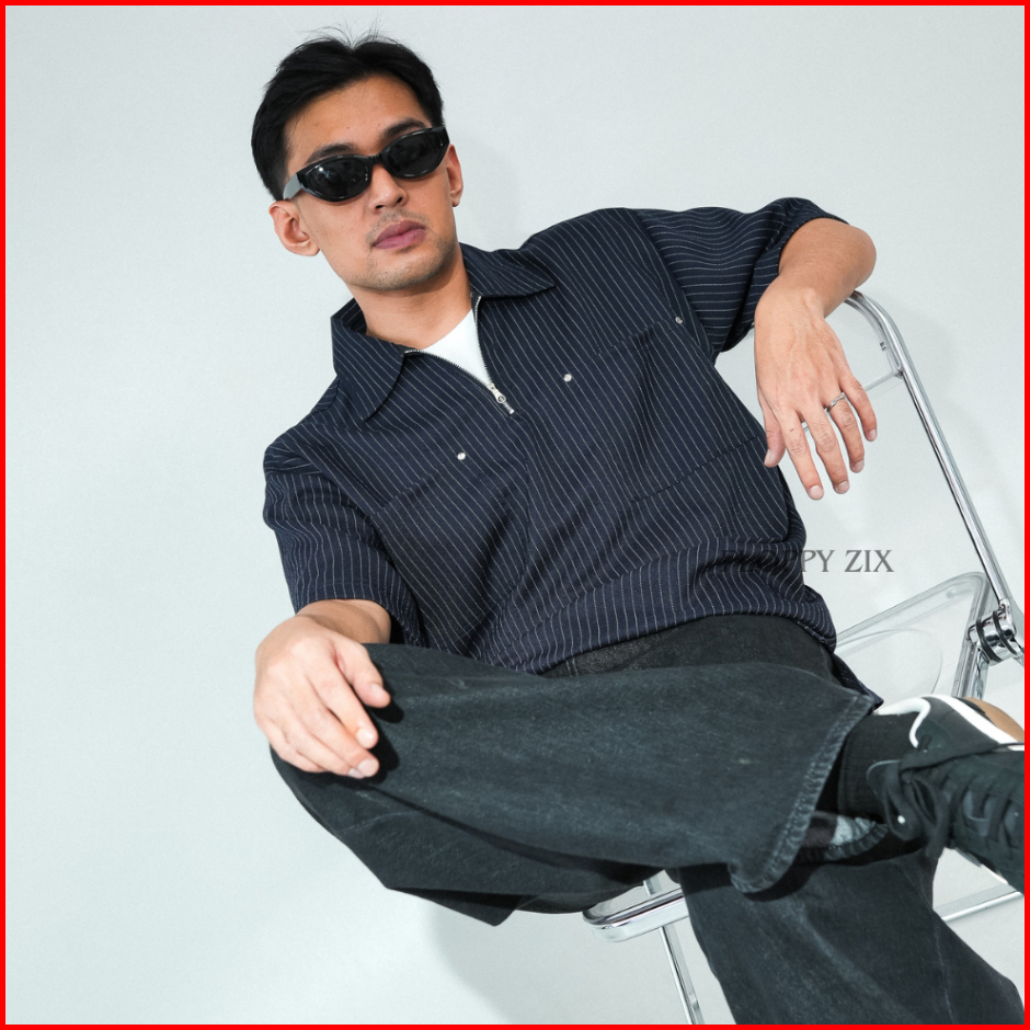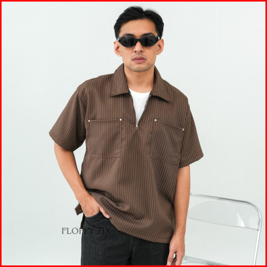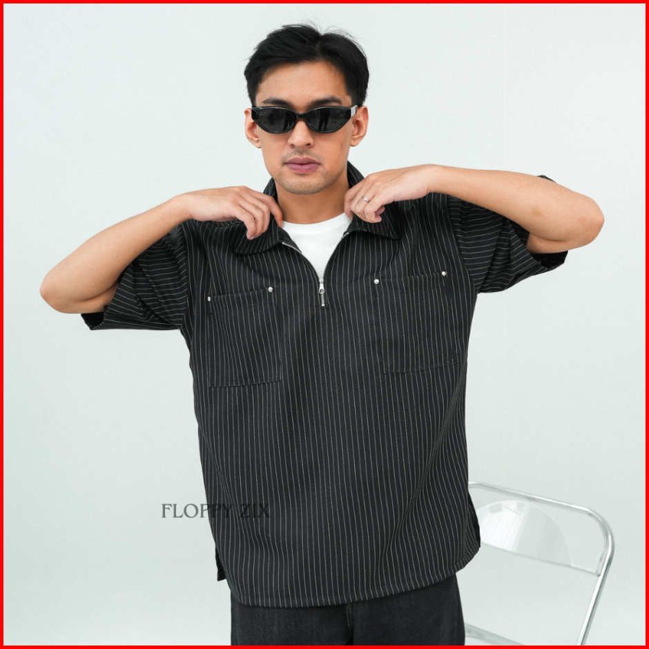 Kameja Stripe Zipper Oversize Kameja Salur Kameja Tangan Pendek Kameja Garis Garis