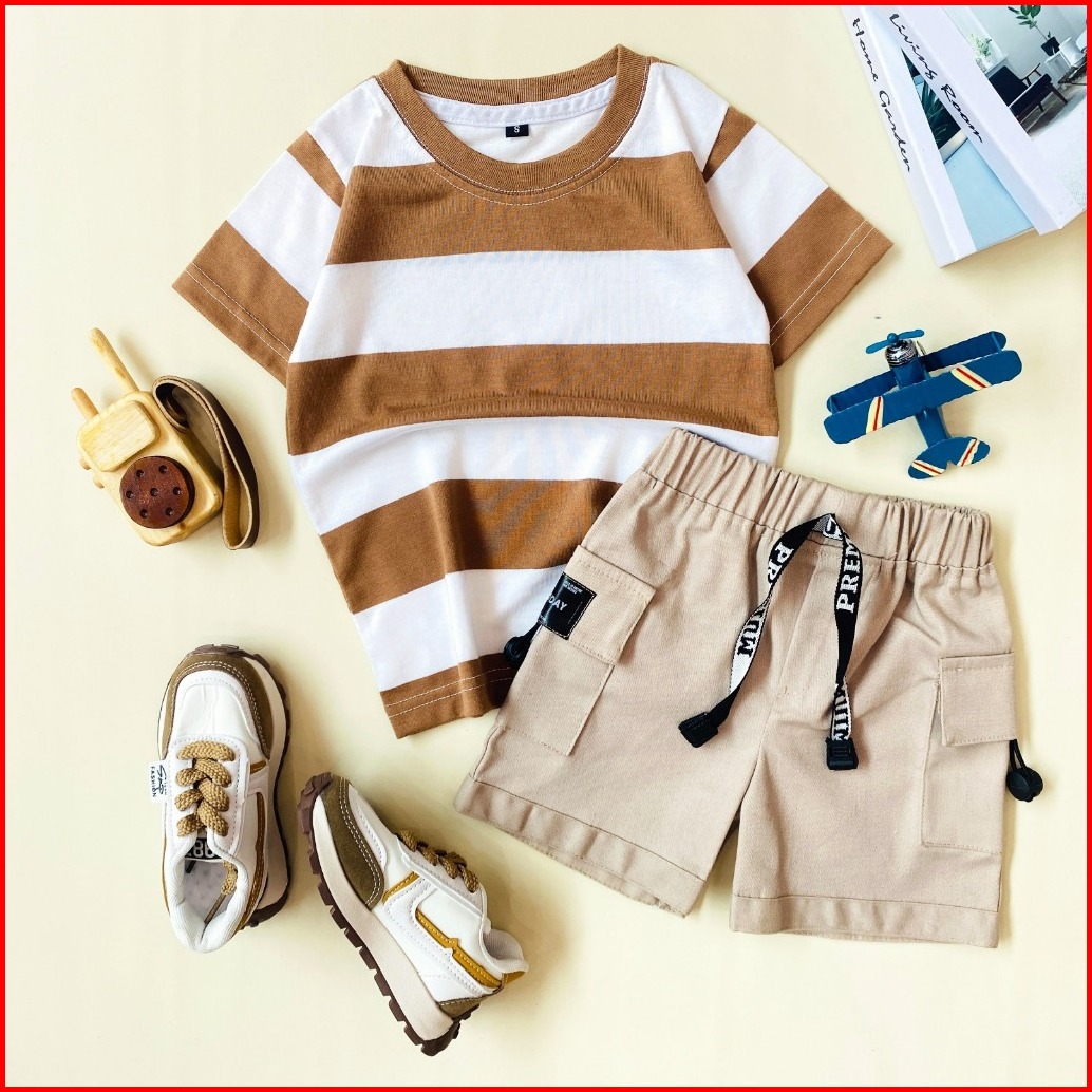Estishop X Dinoday Baju Setelan Anak Laki Kaos Salur Stripe Mountain Celana Pendek 1-7 Tahun