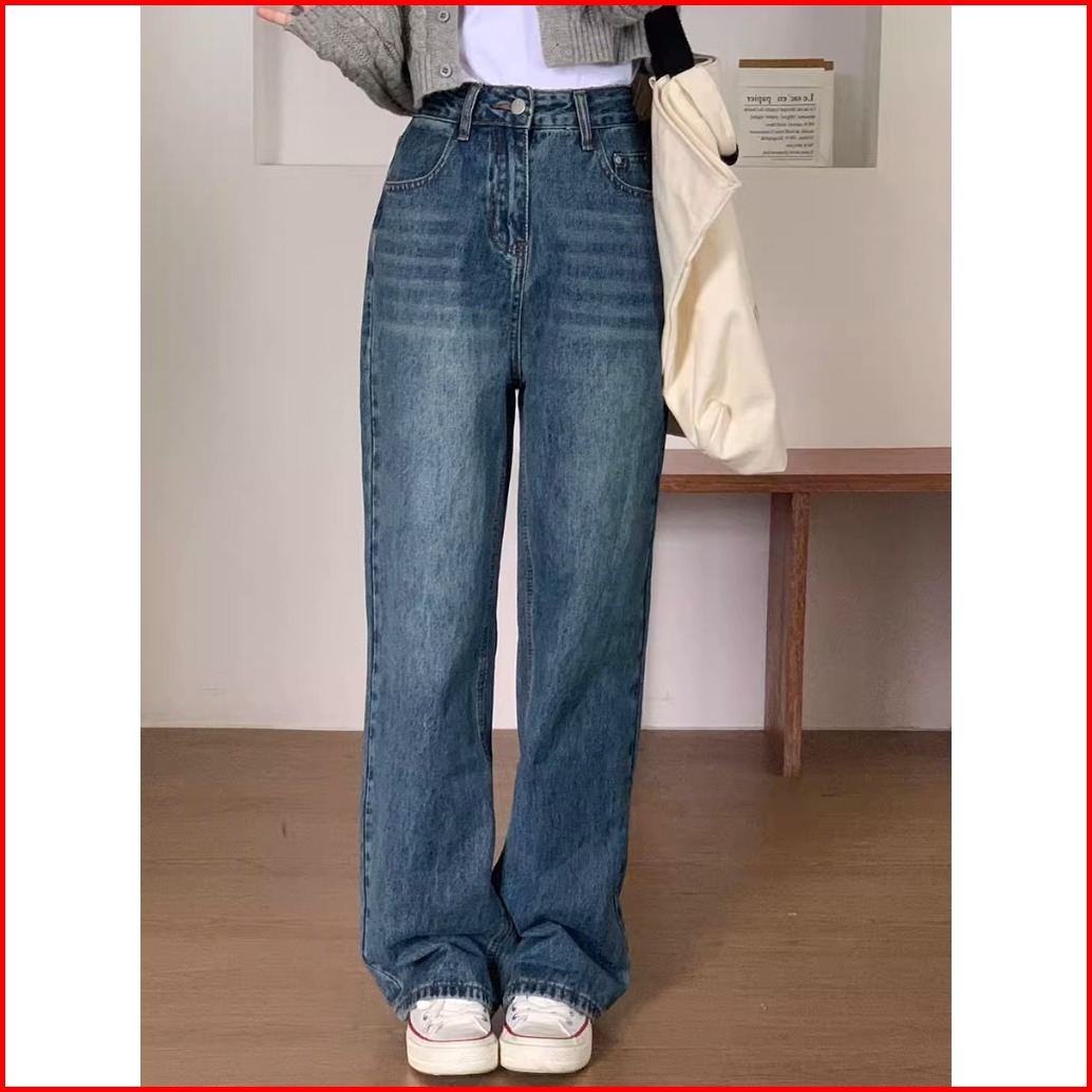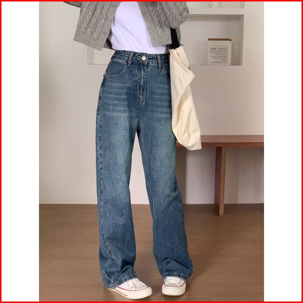 Biru Retro Amerika Lurus Celana Jeans Wanita Highwaist Denim