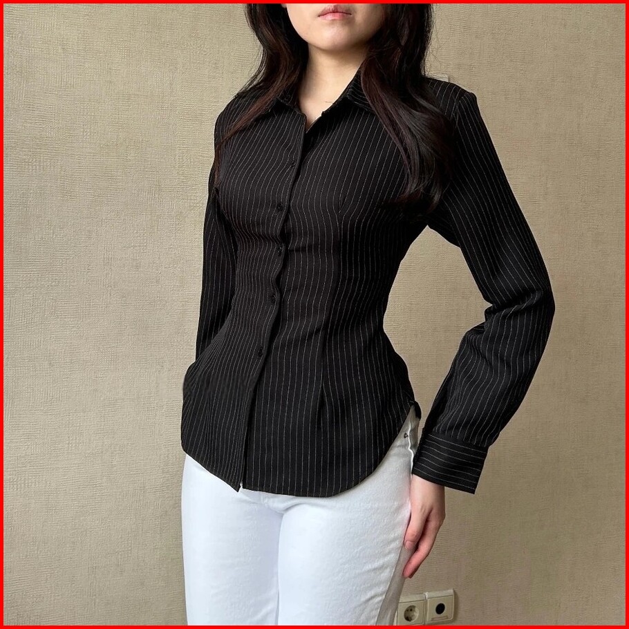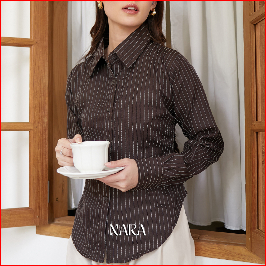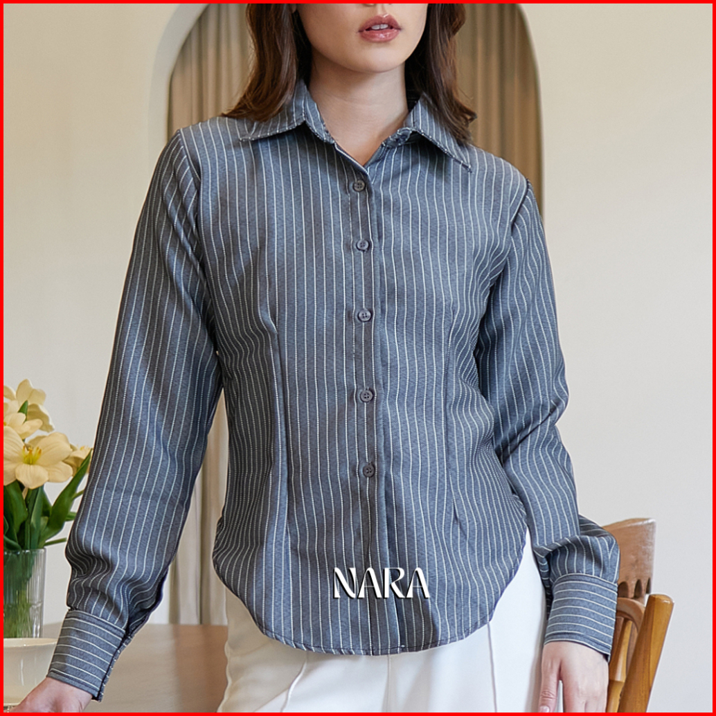Nara Kemeja Wanita Bodyfit Motif Garis Garis Salur Kemeja Kerja Elton Stripe Fitted Shirt Atasan