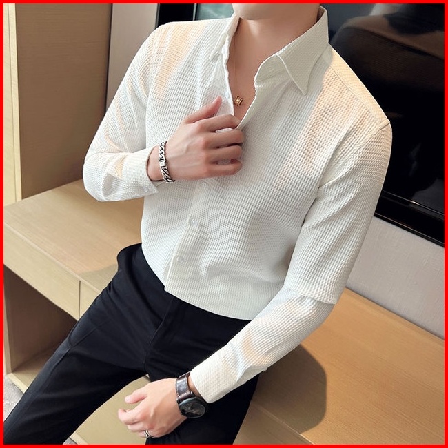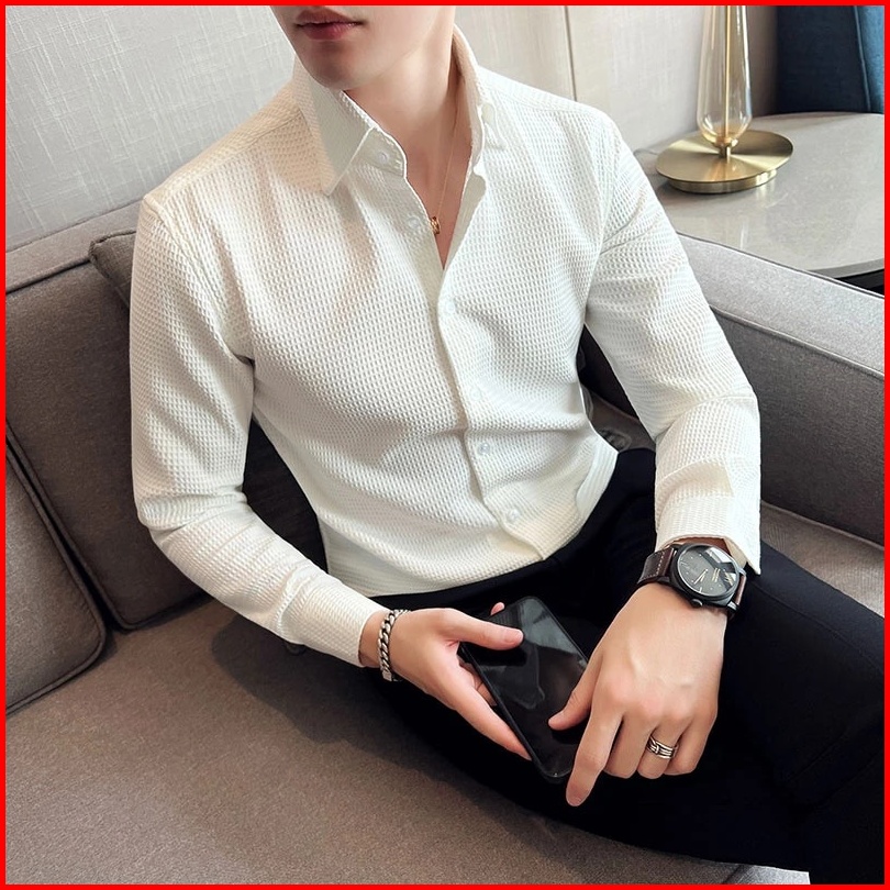 Safa Factory - Kemeja Pria Waffle Knit Baju Atasan Pria Lengan Panjang Motif Polos Slimfit Putih