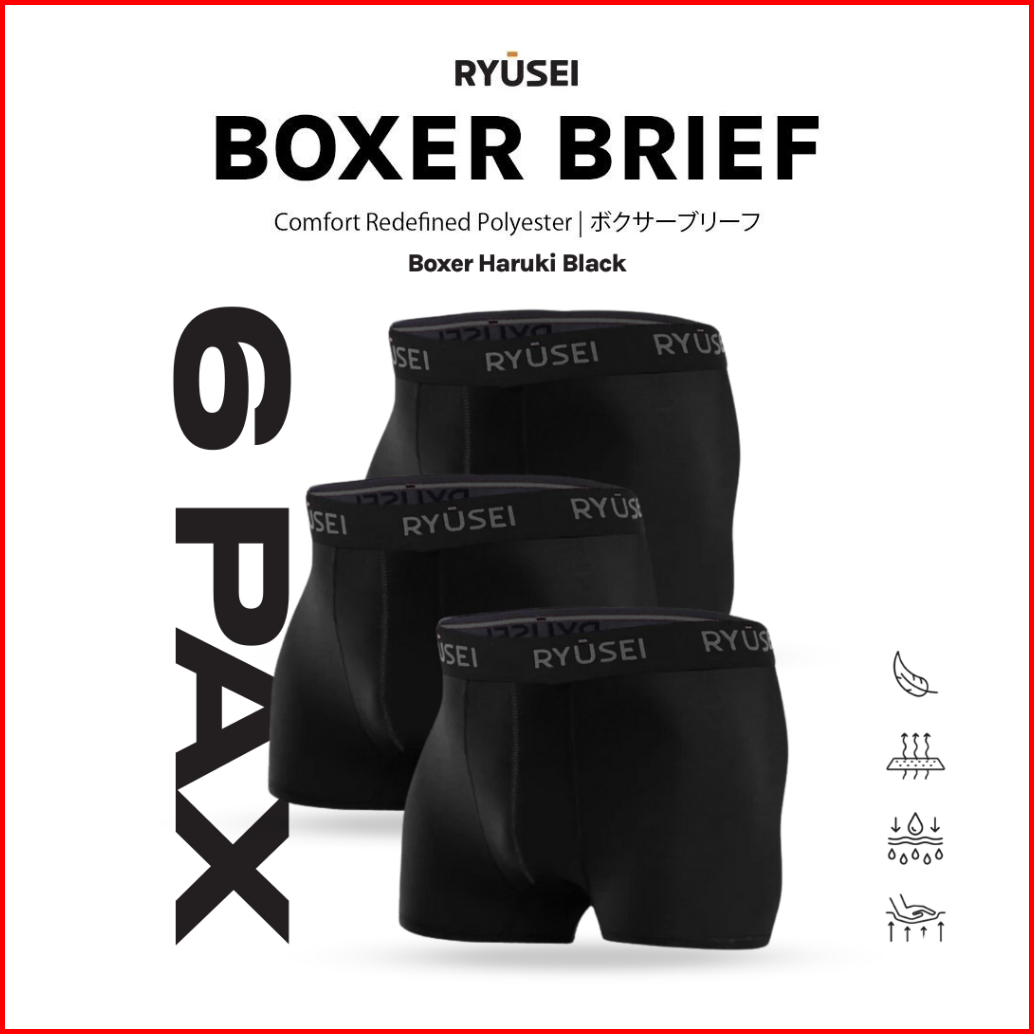 Ryusei Boxer Haruki Polyester Spandex 6 Pcs - Black Nyaman Elastis