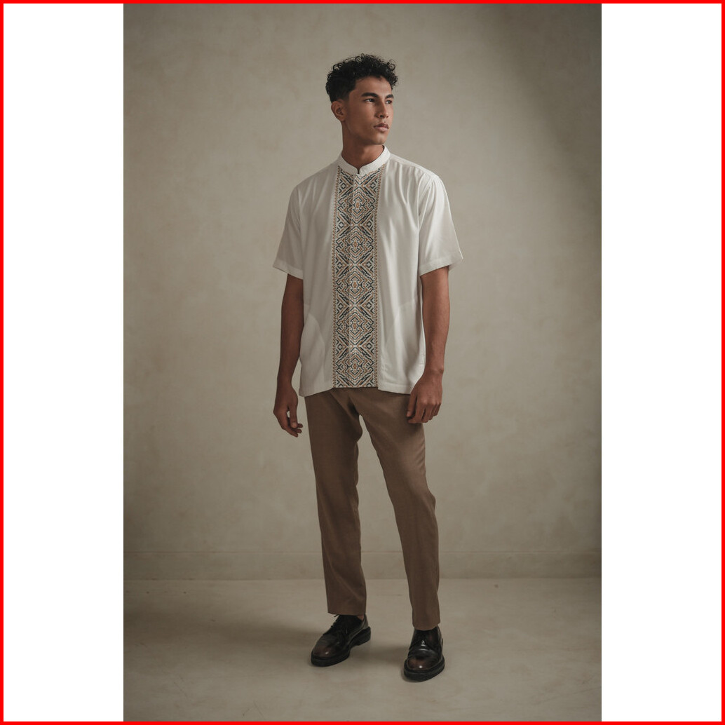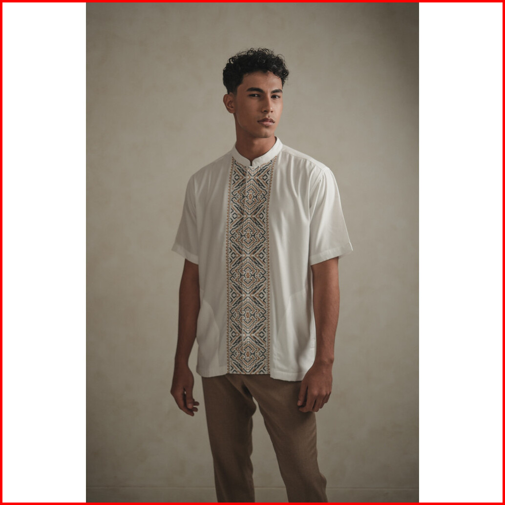 Larusso Kemeja Koko Bordir Lengan Pendek Pria - Orange Navy