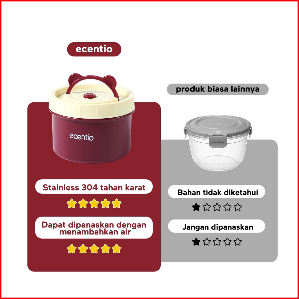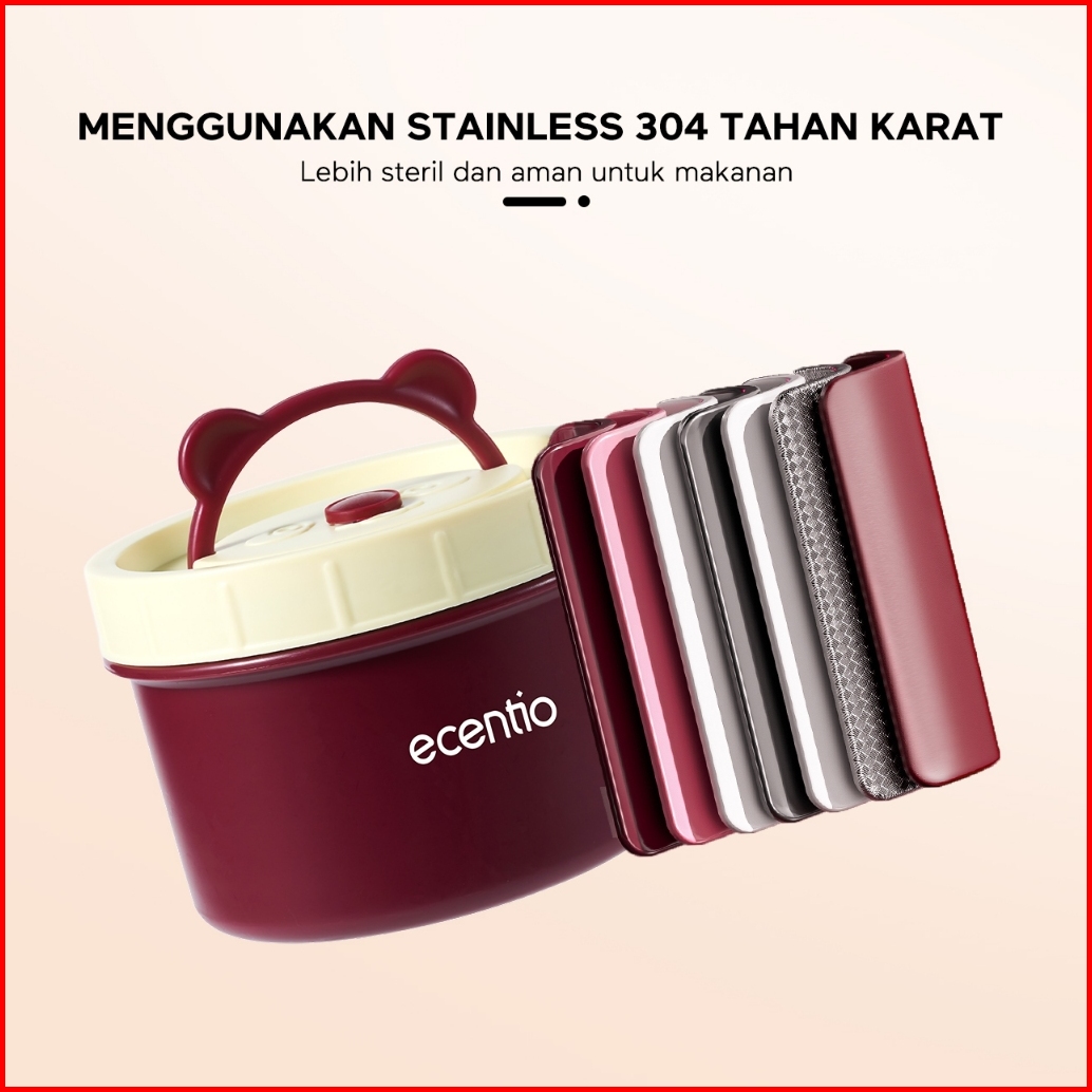 Ecentio Lunch Box Kotak Makan 4pcs Set Stainless 304 Anti Tumpah Merah