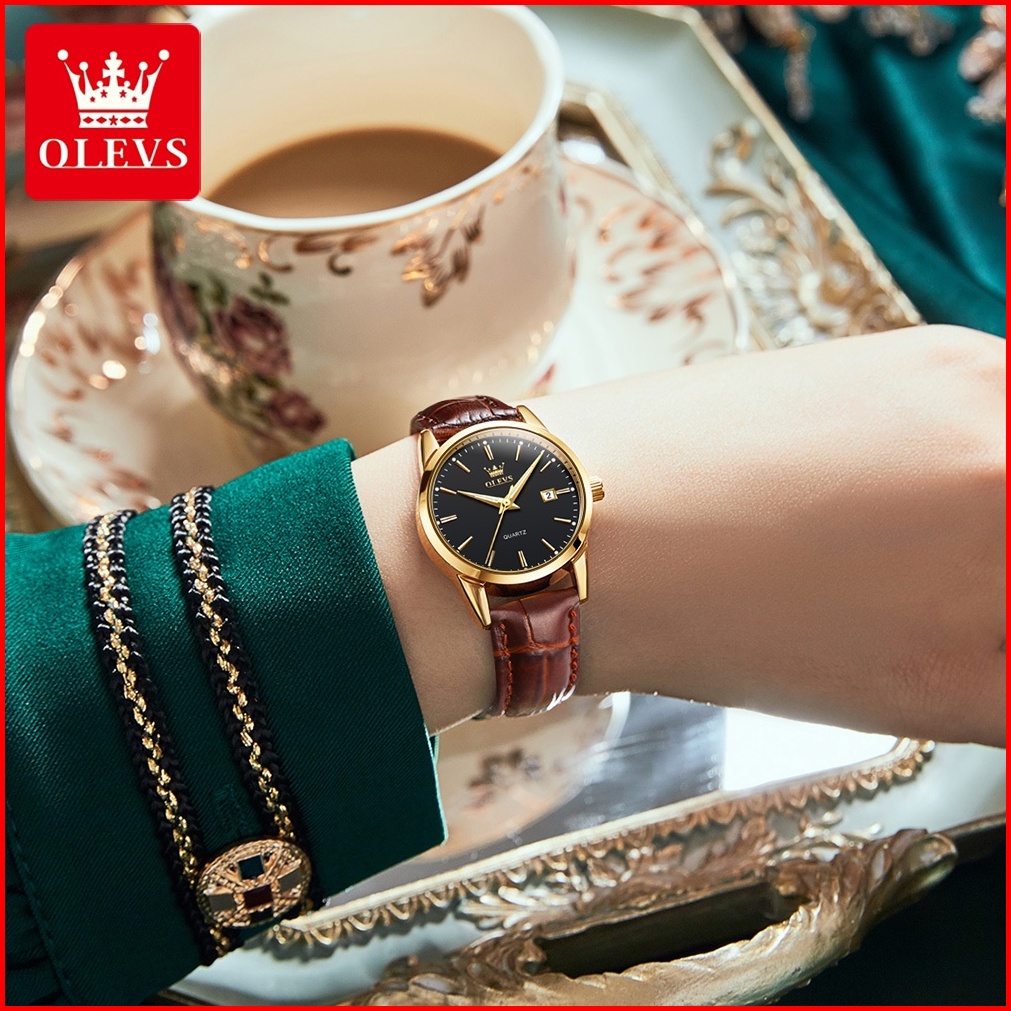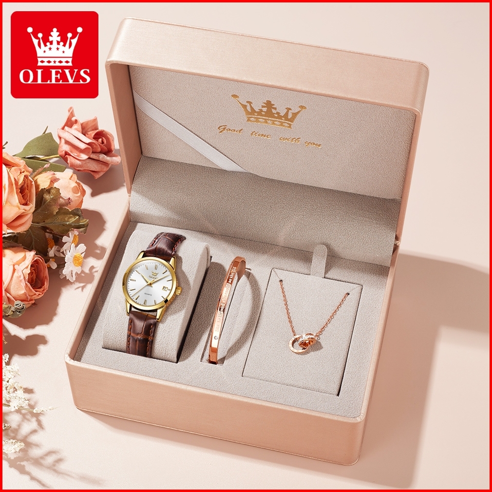 Olevs Jam Tangan Wanita Anti Air Original Anti Karat Mewah Tali Kulit Set Kalung Gelang Bercahaya Kalender Quartz Watch