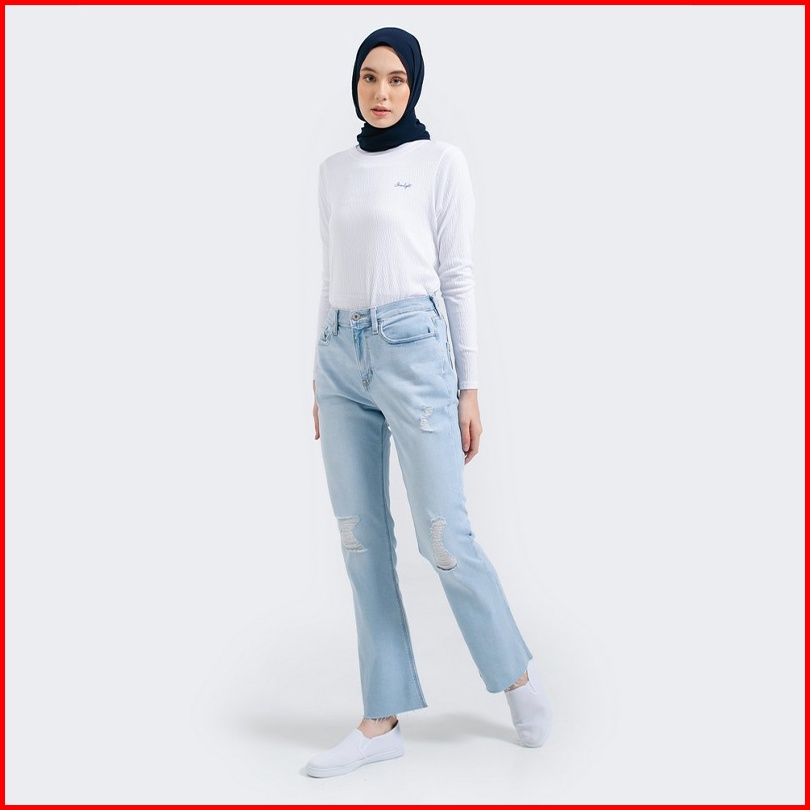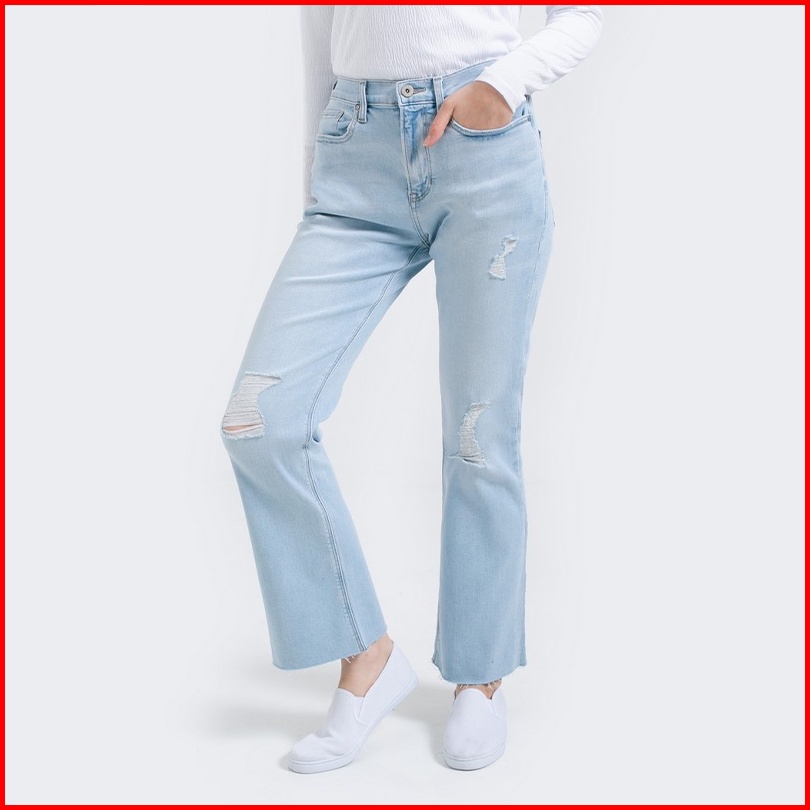 3second Celana Blue Jeans Wanita Washing Denim 90s Flare Ripped Sobek Destroyed Long Jeans Stretch Light Blue 011222