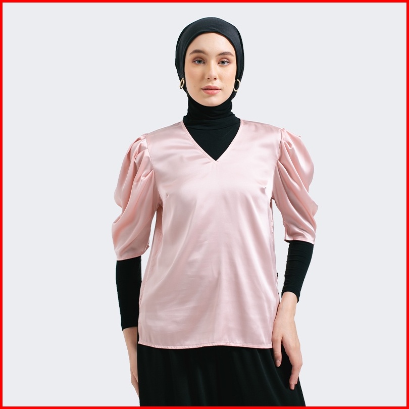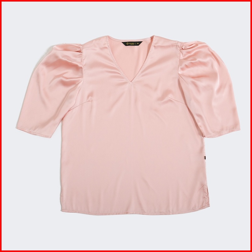 Famo Kemeja Polos Original Lenganpendek Poly Spandex Original Lenganbalon V-neck Wanita Pink Rose 071222