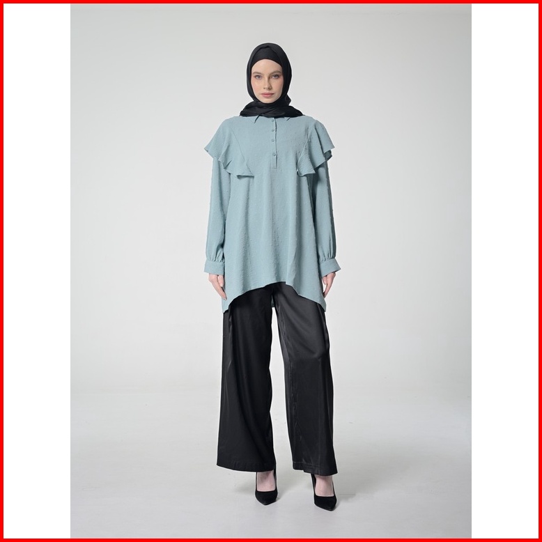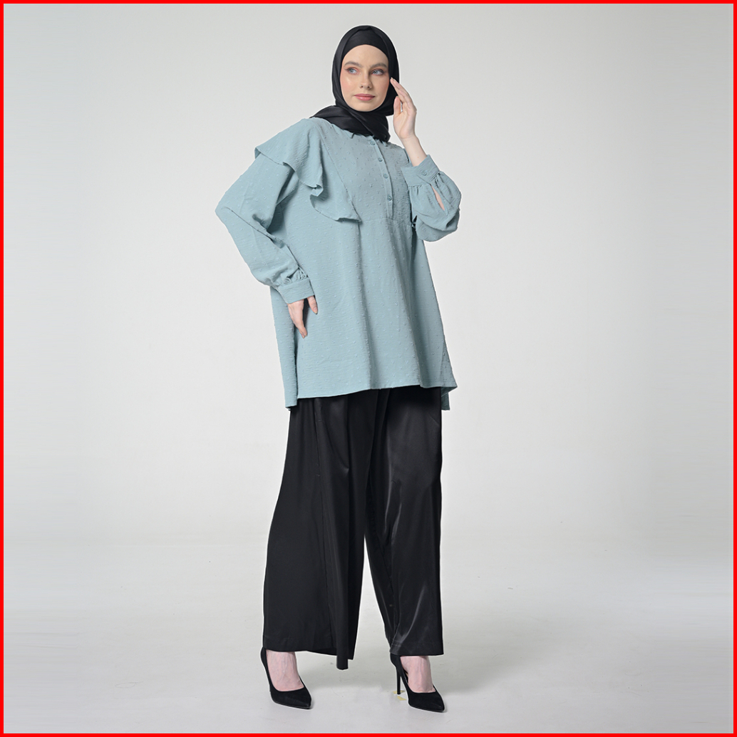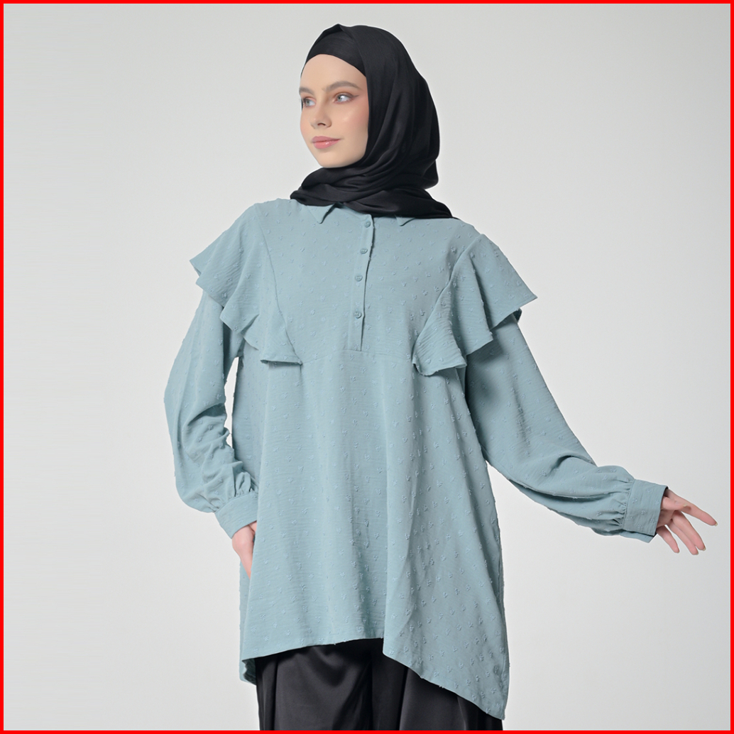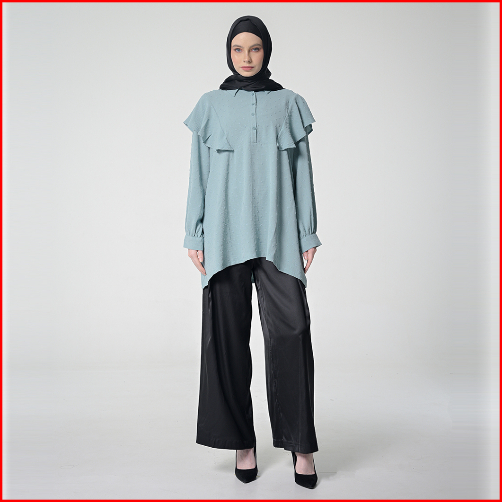 Hanna Kemeja Ruffle Blouse Swizz Dot Mathilda Lengan Panjang Tekstur Baju Atasan Formal Hijau 090323
