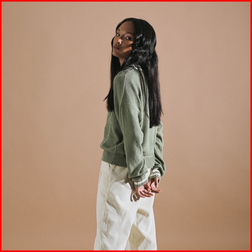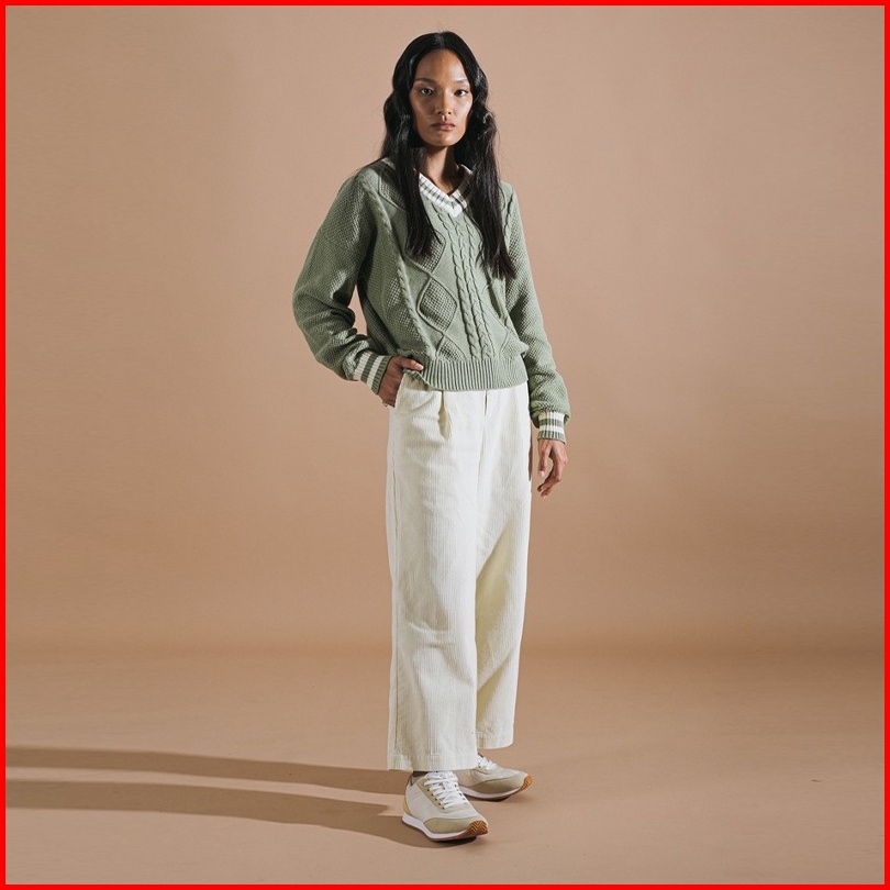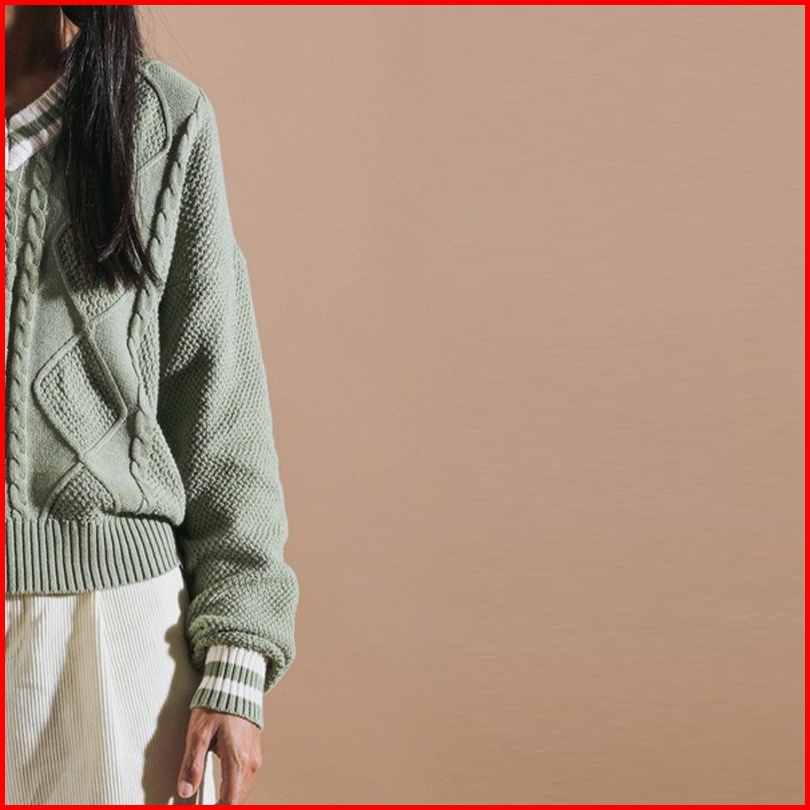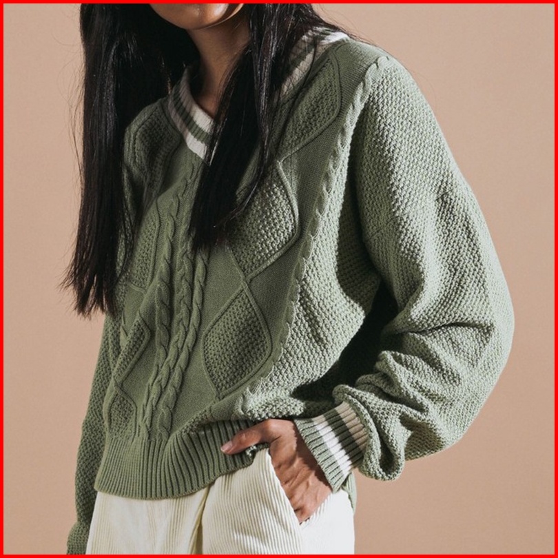 3second Knit V-neck Sweater Wanita Stripe White Knitwear Rajut Atasan Wanita Casual Hijau 060423