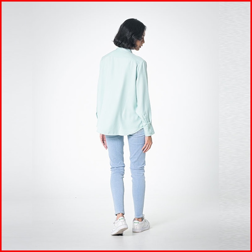 3second Kemeja Lengan Panjang Basic Wanita Bahan Satin Dengan Saku Pockets Polos Hijau 100323