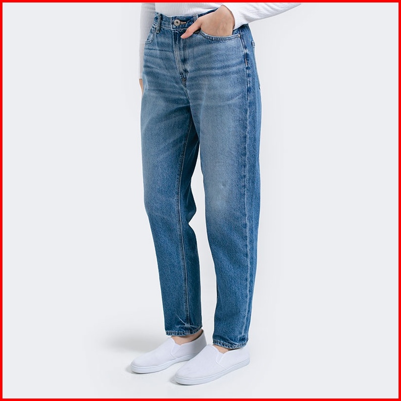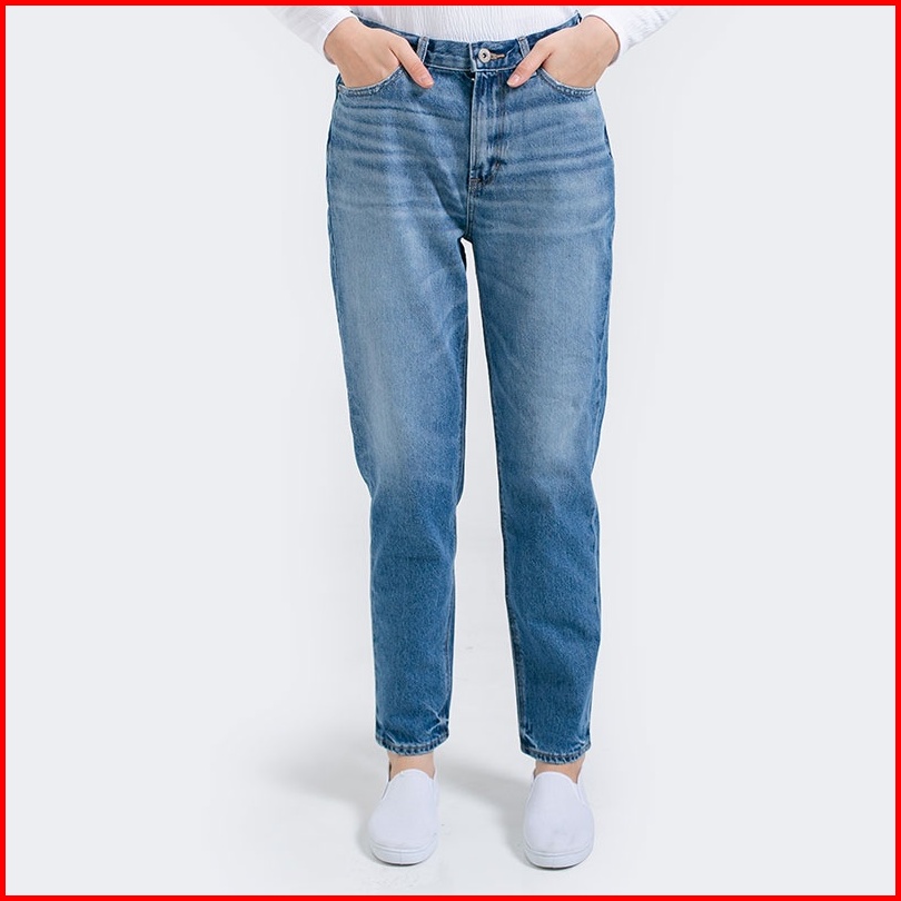 3second Original Celana Mom Jeans Panjang 100 Cotton Katun Long Pants Denim Non Stretch Wanita Dark Blue 091222