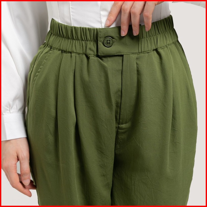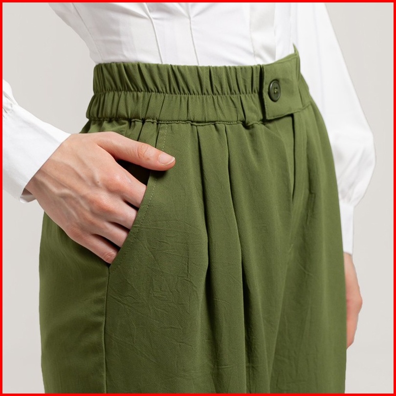 Famo Original Celana Kulot Elastic Waist Pinggang Karet Poly Crinkle Long Pants Basic Wanita Hijau Green Pesto 020222