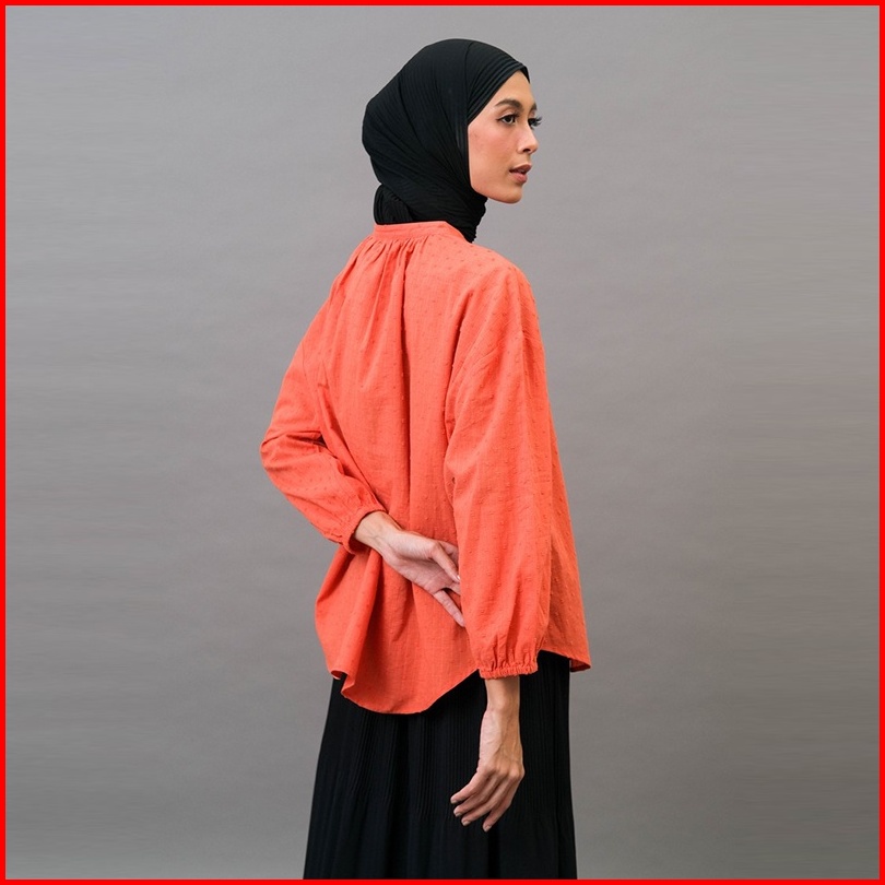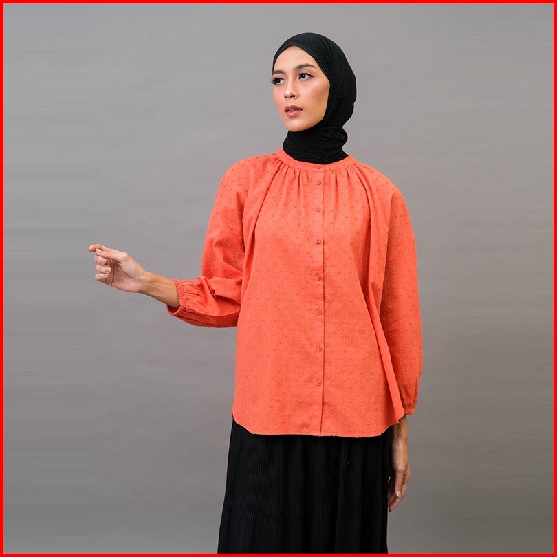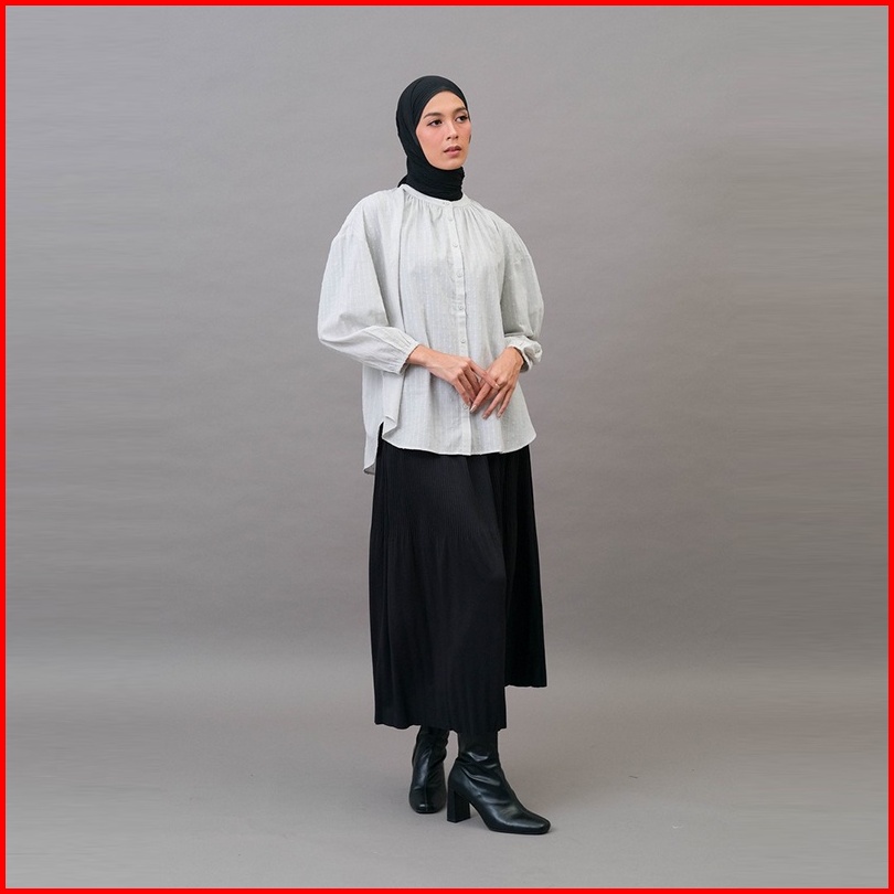 Hanna Kemeja Wanita Kerah Bulat Lengan Panjang Women S Long Shirt Blouse Dorby Stripe With Swiss Dot Raya C030823