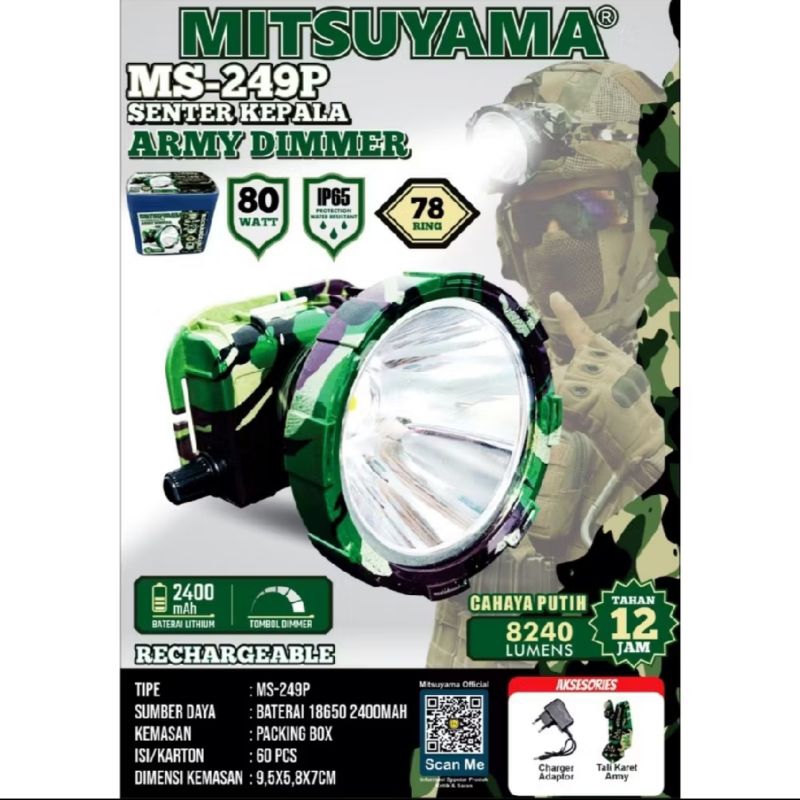 mitsuyama ms-249p senter kepala 80watt cahaya putih loreng