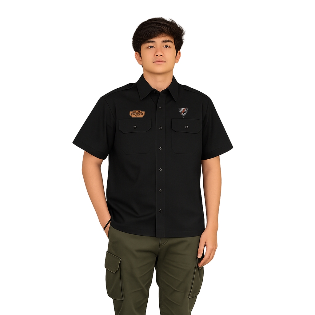 Devvogue Kemeja Workshirt Pria Vintage Electrical Skull Pdh Hitam Bahan American Drill