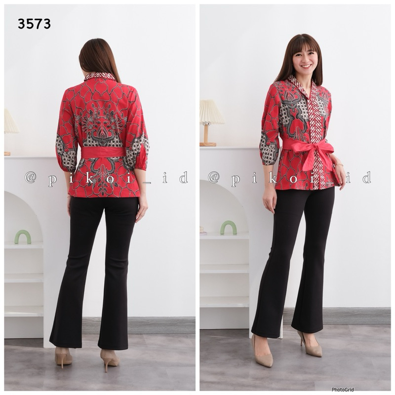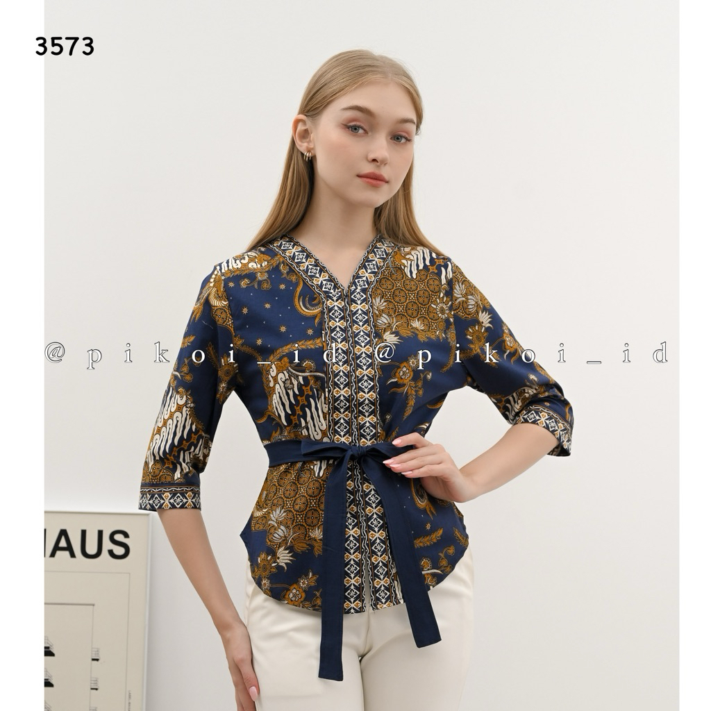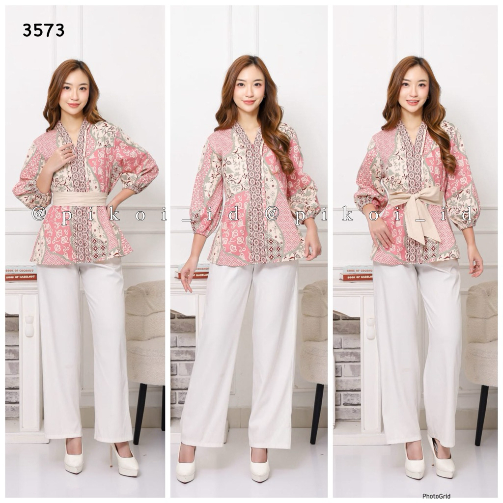 Atasan wanita batik modern v neck lengan balon pastel / baju batik busui modern zipper dan belt 3573