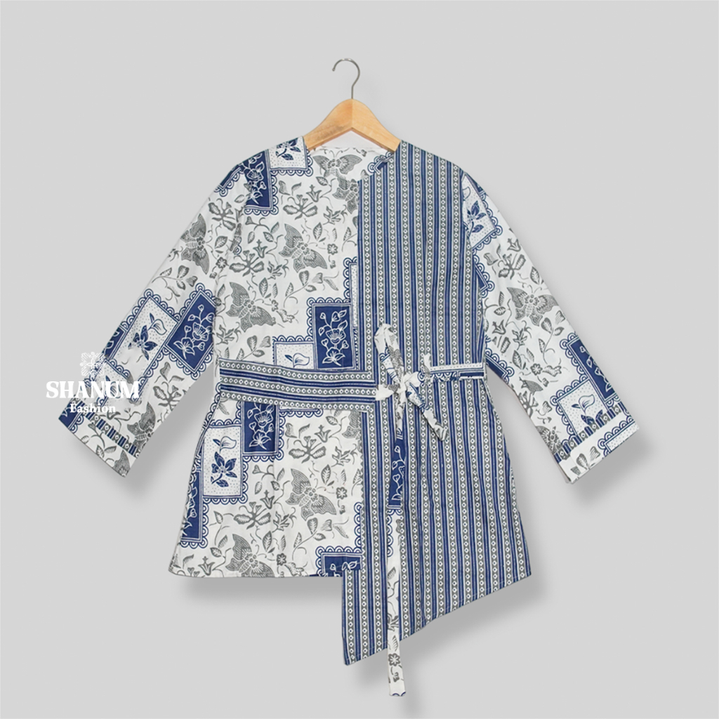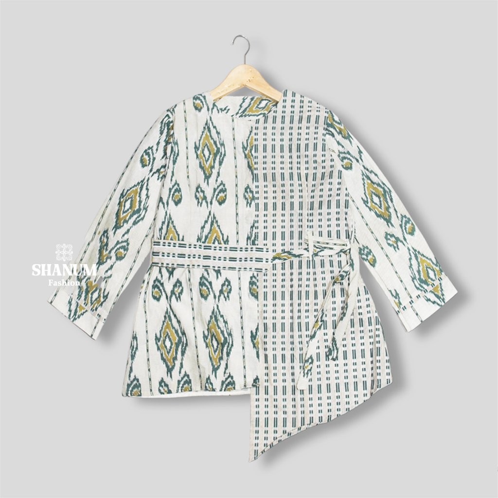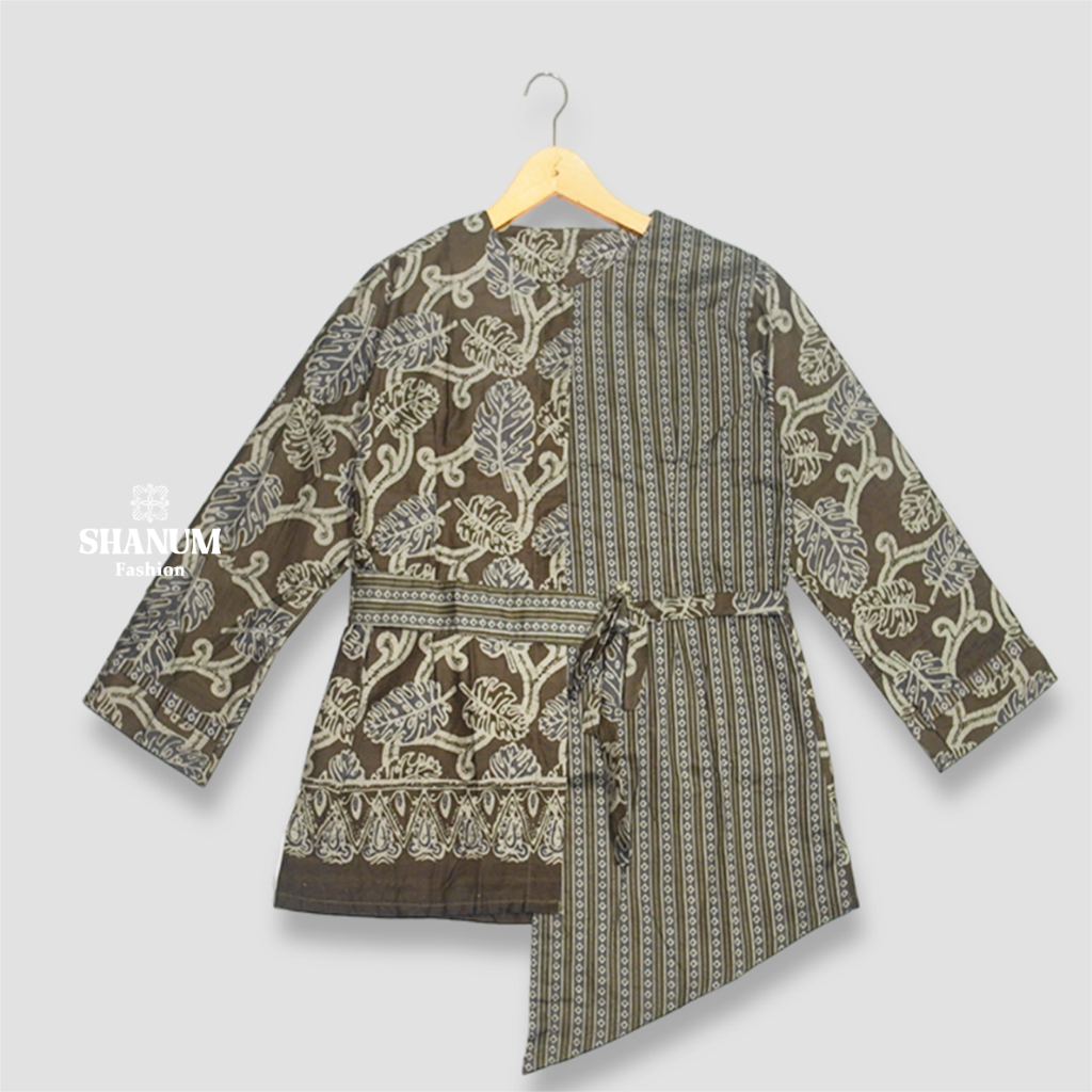 SHANUM Batik Kerja Wanita Modern Lengan 3/4 Panjang Motif Songket Tenun Bahan Katun Kombinasi Polos Tali Serut Blouse Ka