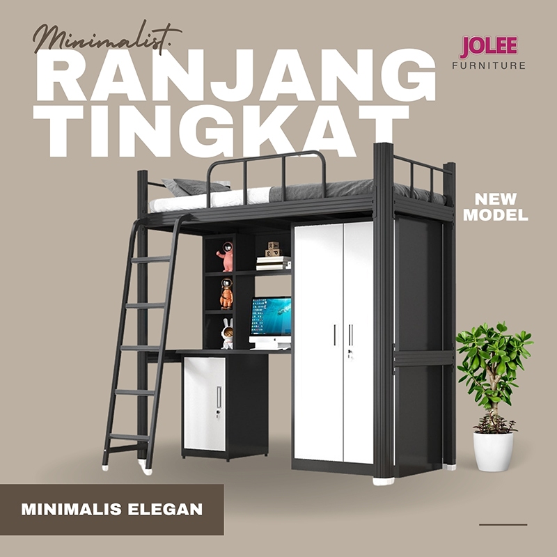 Tempat tidur susun kursi besi, tempat tidur susun atas, dan lemari besi bawah + meja + rak buku
