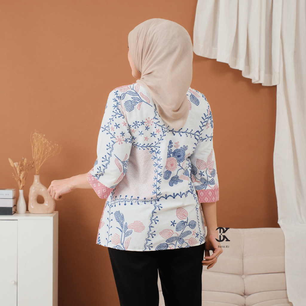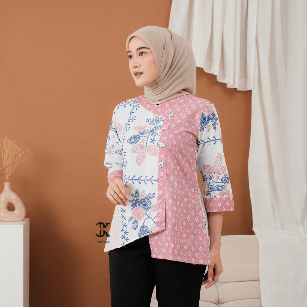 Batik Wanita Modern Kerja Lengan 3/4 Kancing Depan Katun Premium Baju Atasan Kantor Elegan Terbaru