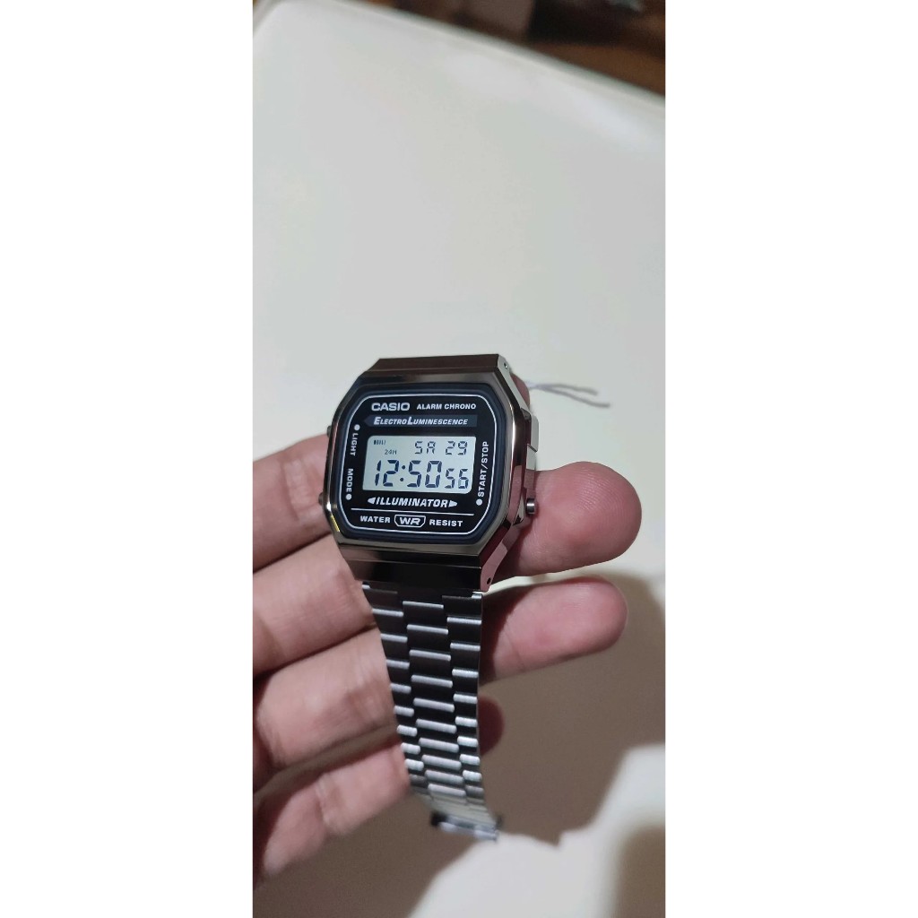 Jam Tangan Unisex Digital Casio Standard A168WGG-1ADF A168 Vintage Digital Dial Grey Stainless Steel Band