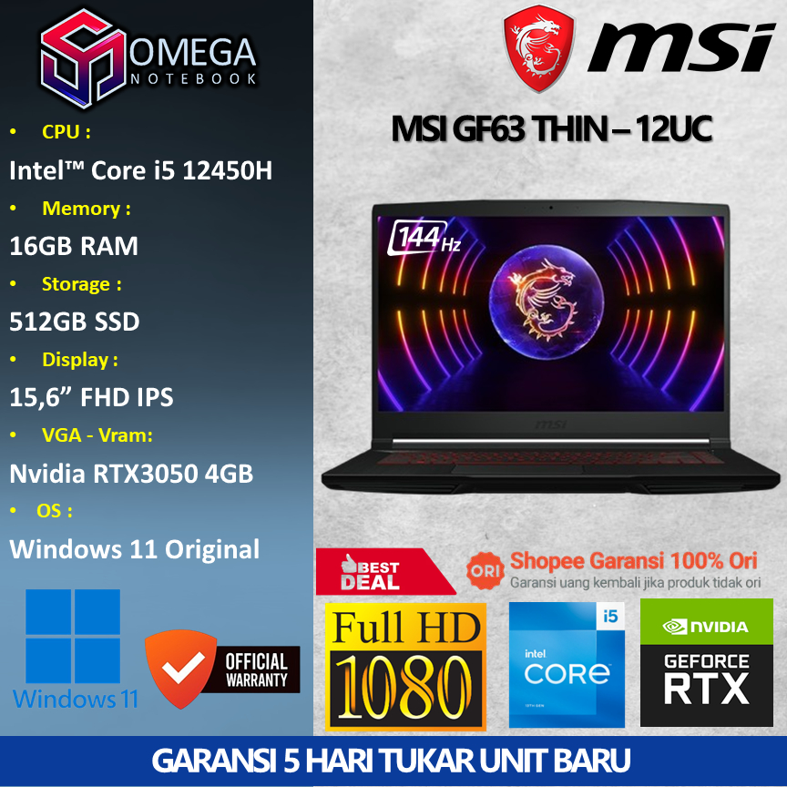 MSI GF63 Thin 12UC i5 12450H 16GB 512GB RTX3050 4GB 15,6 FHD Windows 11
