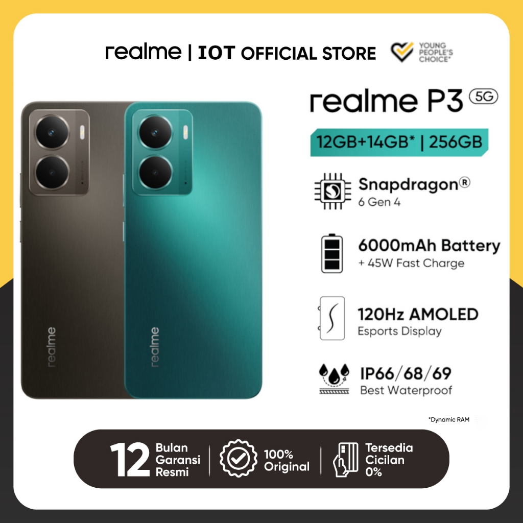 (Cuma Hari Ini Gratis Holder HP) realme P3 5G 12GB+14GB|256GB (Snapdragon® 6 Gen 4 | 6000mAh Battery | 45W Fast Charge | NFC)(Pilihan Resmi,Harga Historis RendahAman Digunakan, 2025Laris)