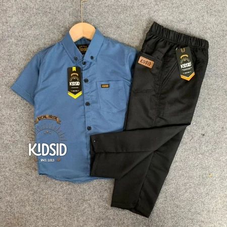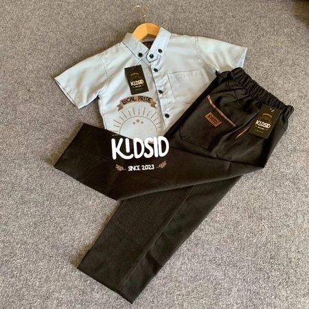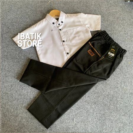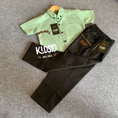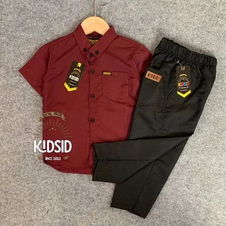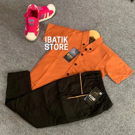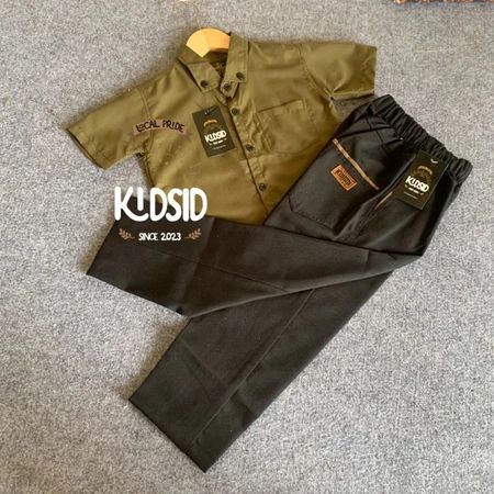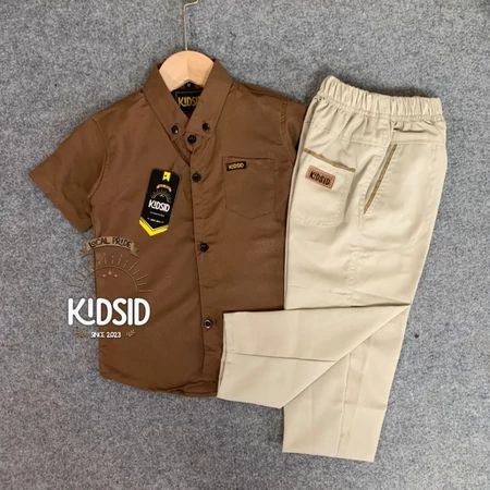 Setelan kemeja anak lengan pendek warna Dark Brown + celana chinos usia 1-14 Tahun - One set Baju setelan anak Bahan Kat