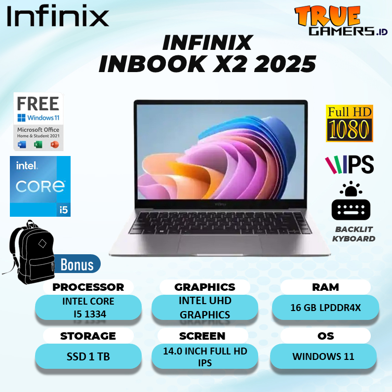 Laptop Infinix Inbook X2 2025 I5 1334 RAM 16GB SSD 1TB W11 14.0FHD IPS 100SRGB Fast Charging