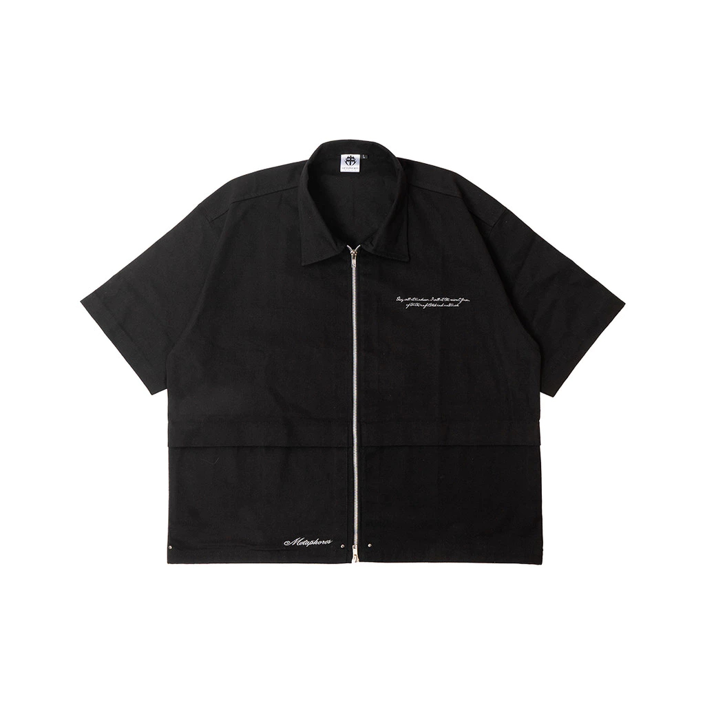 Kemeja Workshirt Metaphores Midnight Boxy Shirt ZIpper Unisex Twill Black Premium Kemeja Pria Lengan Pendek Best Seller