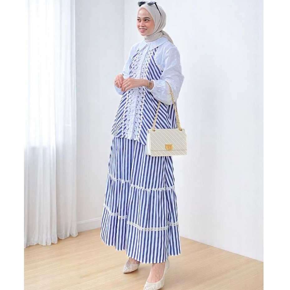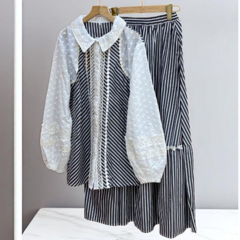 Mazaya Oneset Rok Wanita Kemeja Set Salur | Setelan Kemaja Katbol Rok Wanita