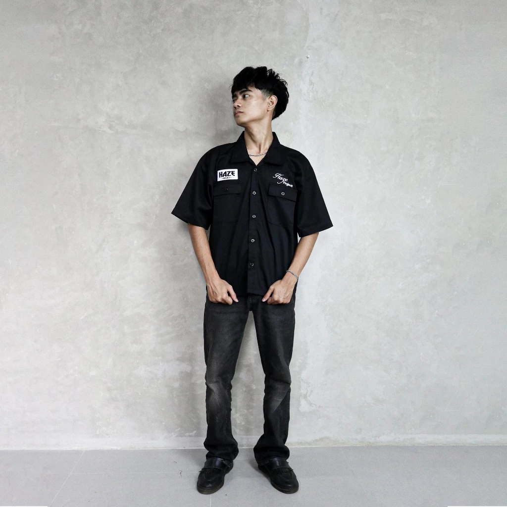 Kemeja Workshirt Open Collar Boxy Fit Black Haze Project Series Premium Kemeja Pria Unisex Lengan Pendek Best Seller