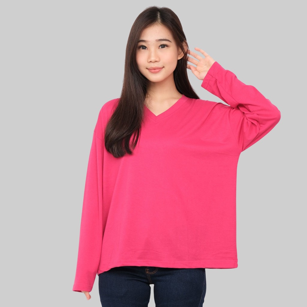 Fashion Lu Store Monellina V.PJG Kaos Oversize Wanita Lengan Panjang V-Neck Polos