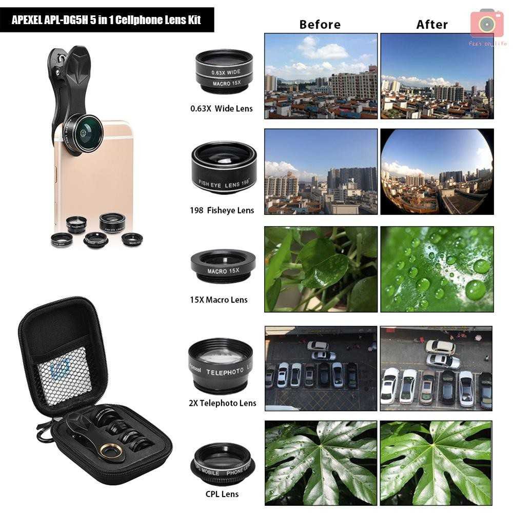 APEXEL 5 in 1 Lensa CPL Fisheye Macro Telephoto Wide Angle - APL-DG5H