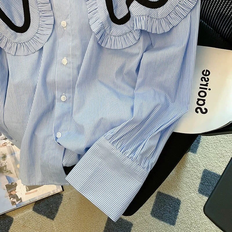 Fashion Lu Store Vallina Outfit - Cameron Top Blouse Bertha Collar Atasan Shirt Kemeja Stripe Salur Cotton Korean Remaja Wanita Premium