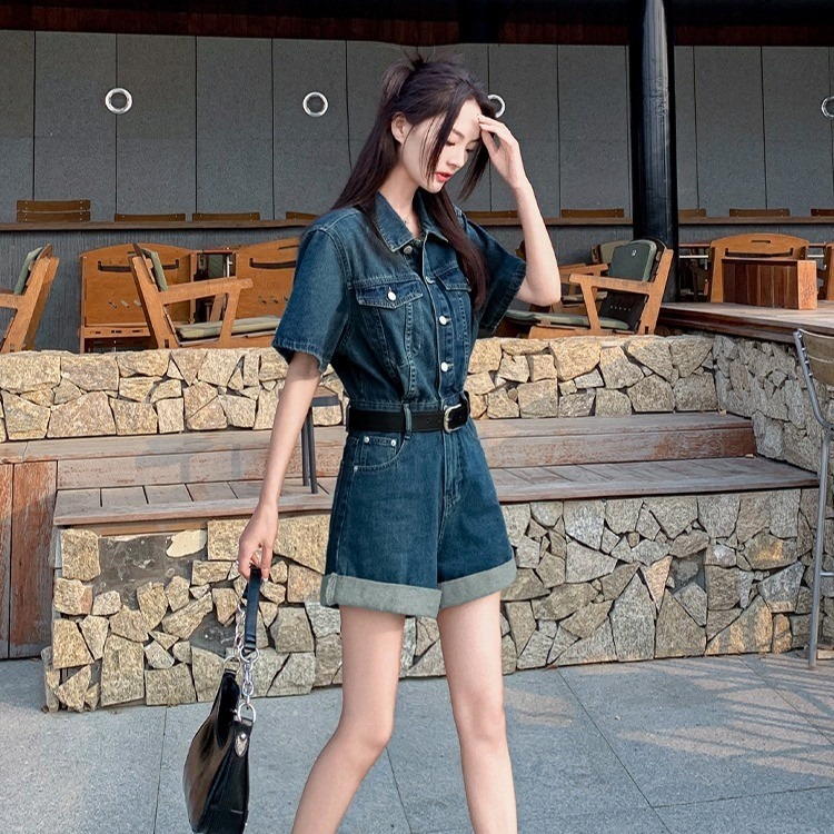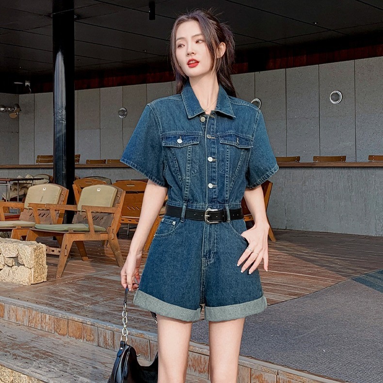 Fashion Lu Store [NANA]Retro waist denim jumpsuit celana pendek wanita high-end new tooling suit jumpsuit celana pendek wanita(Tidak termasuk ikat pinggang) 043