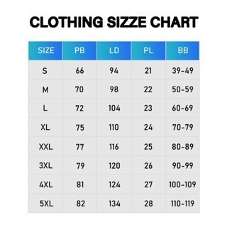 S: (39-49KG), M: (50-59KG), L: (60-69KG), XL: (70-79KG), XXL: (80-89KG), XXXL: (90-99KG), XXXXL: (100-109KG), XXXXXL: (110-119KG)