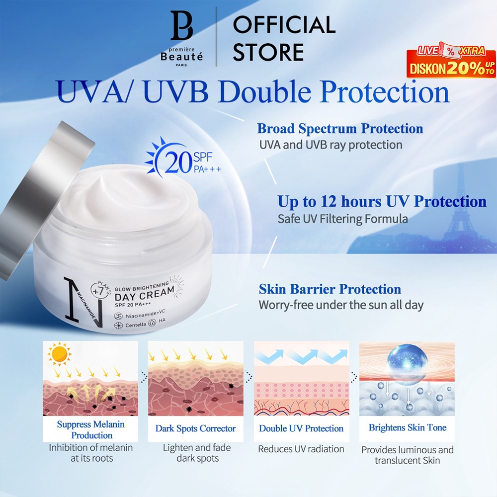 PREMIERE BEAUTE Day Cream Niinamide Centella pelembab wajah White Glow Brightening 30g 20SPF PA+++ Cream Pemutih Wajah C