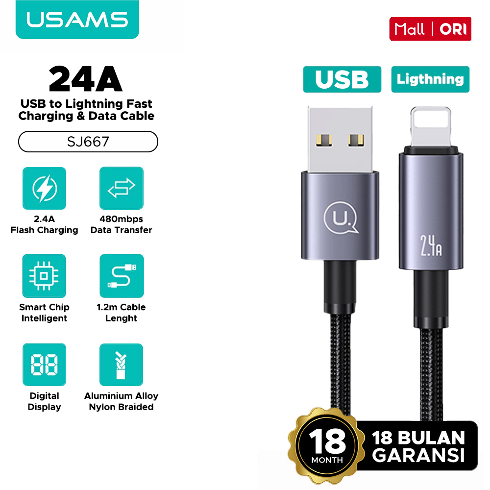 USAMS Kabel Data USB to Lightning 2.4A Fast Charging 480Mbps 1.2M Aluminium Braided SJ667