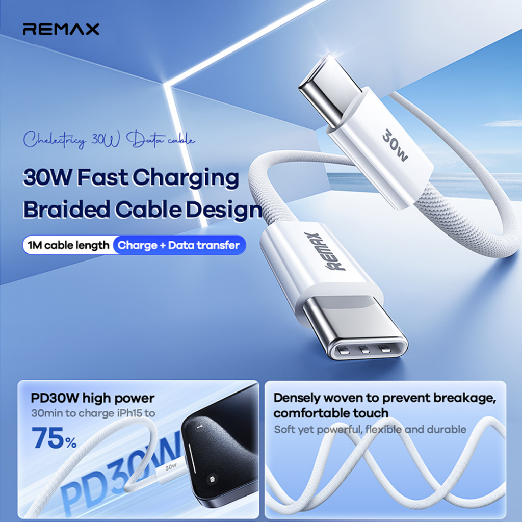 Remax Data Cable Braided Fast Charging PD 30W Type-C to Type-C Smart Chip 1M RC-C010