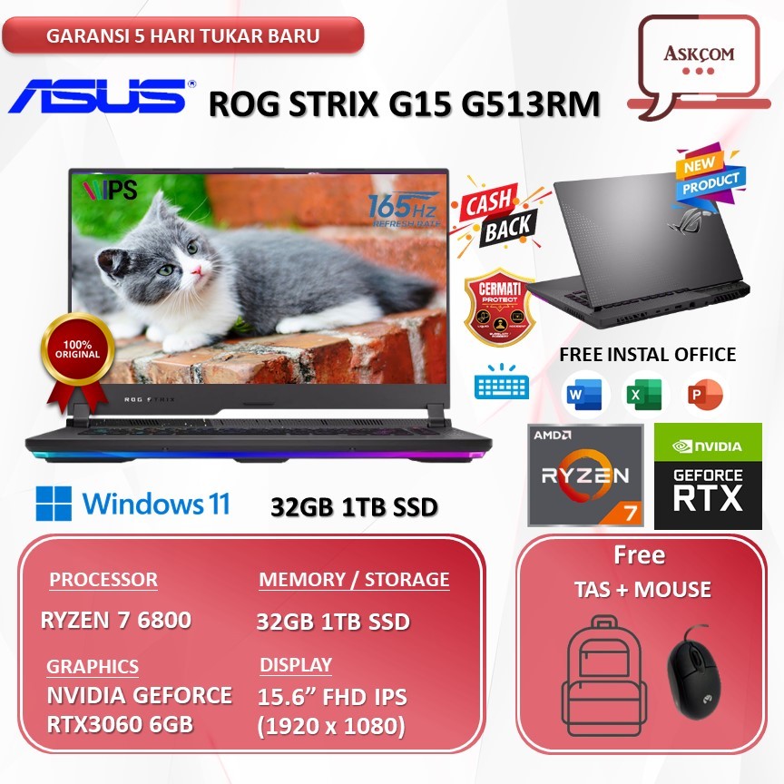 Laptop Asus Rog Strix G513RM RTX3060 6GB RYZEN 7 6800 RAM 32GB 2TB SSD 15.6"2K 165Hz W11 RGB KB