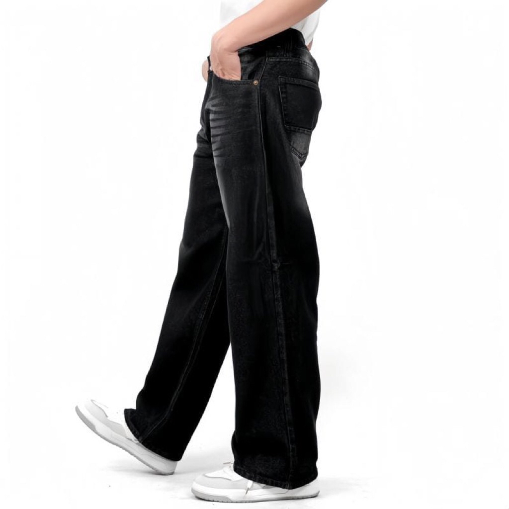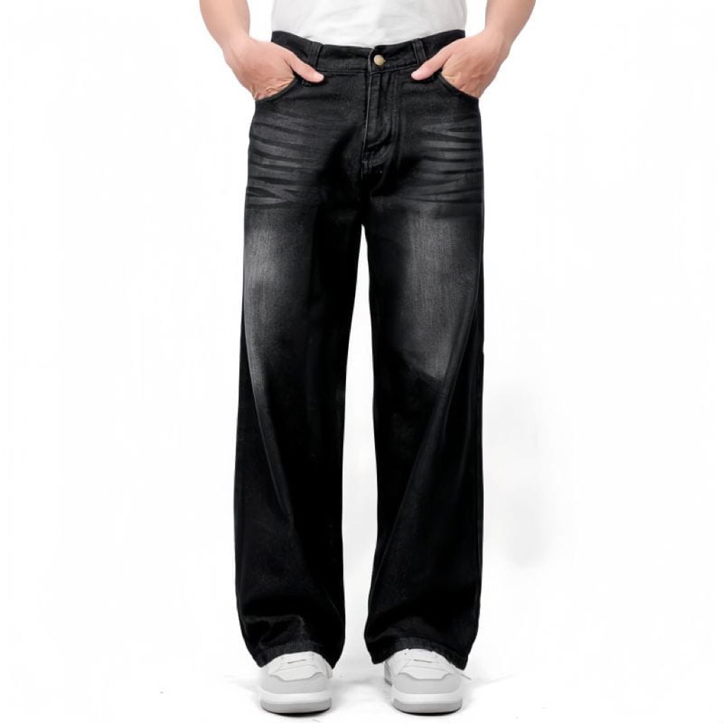 Celana Jeans Wisker Pria Unisex Wide Leg Lebar Gombrong Skena 27-34