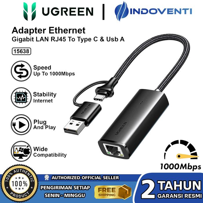 UGREEN USB TYPE C 3.1 USB 3.0 GIGABIT ETHERNET ADAPTER TO RJ-45 LAN 1000MBPS KOMPUTER LAPTOP - 15638